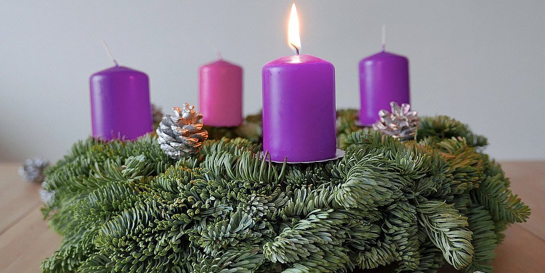 Drei violette Kerzen und eine rosafarbene Kerze – so sieht der sogenannte LITURGISCHE ADVENTSKRANZ aus: Violett, die Farbe der Buße, ist die liturgische Farbe des Advent, denn die Vorbereitungszeit auf Weihnachten sollte eigentlich auch von Besinnung, Umkehr und Buße bestimmt sein. Am 3. Adventsonntag, dem „Gaudete Sonntag“, wird die Bußzeit unterbrochen und die rosafarbene Kerze angezündet, auch die Messgewänder im Gottesdienst sind rosafarben. Damit wird die Vorfreude auf das Hochfest Weihnachten zum Ausdruck gebracht.