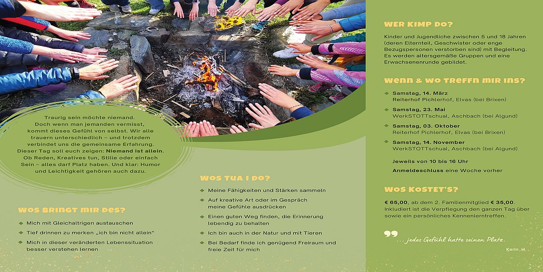 An vier besonderen Tagen im Jahr treffen sich Kinder und Jugendliche zwischen 5 und 18 Jahren – zusammen mit ihren Bezugspersonen – an Orten, die Ruhe schenken und Mut machen. Einfühlsame Trauerbegleiterinnen begleiten durch den Tag. Mit kreativen Angeboten, Gesprächen, Naturerlebnissen und liebevollen Impulsen öffnen sie Wege, Gefühle auszudrücken und wieder Halt zu finden.