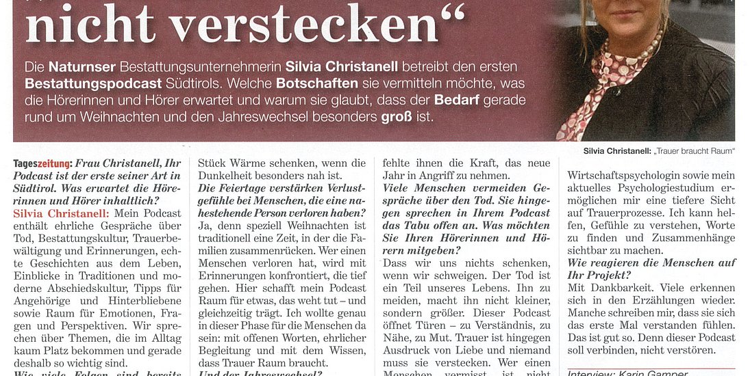 Südtirols erster Bestattungspodcast mit Silvia von Bestattungen Christanell ist ein besonderer Raum für ehrliche Gespräche über Abschied, Trauer und das Leben selbst. Mit viel Feingefühl, Wärme und Erfahrung begleitet Silvia die Zuhörerinnen und Zuhörer durch ein Thema, das oft verdrängt wird, aber uns alle betrifft. Sie spricht offen über den Umgang mit dem Tod, über Verlust, Erinnerungen und darüber, wie wichtig es ist, Raum für Gefühle zuzulassen.