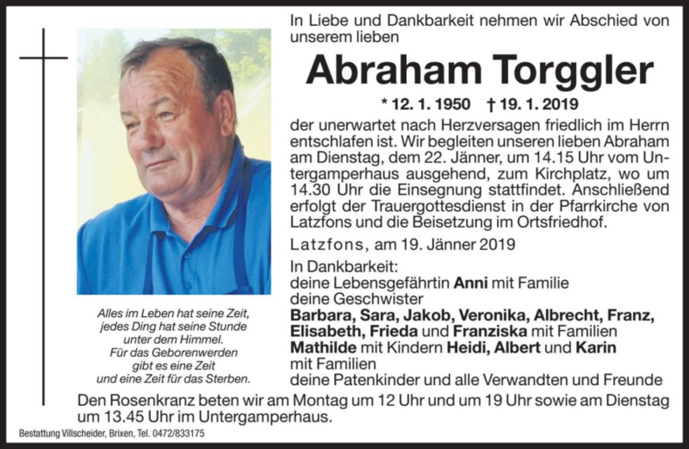 Begräbnisgottesdienst: 22.01. - 14:30 Uhr Latzfons