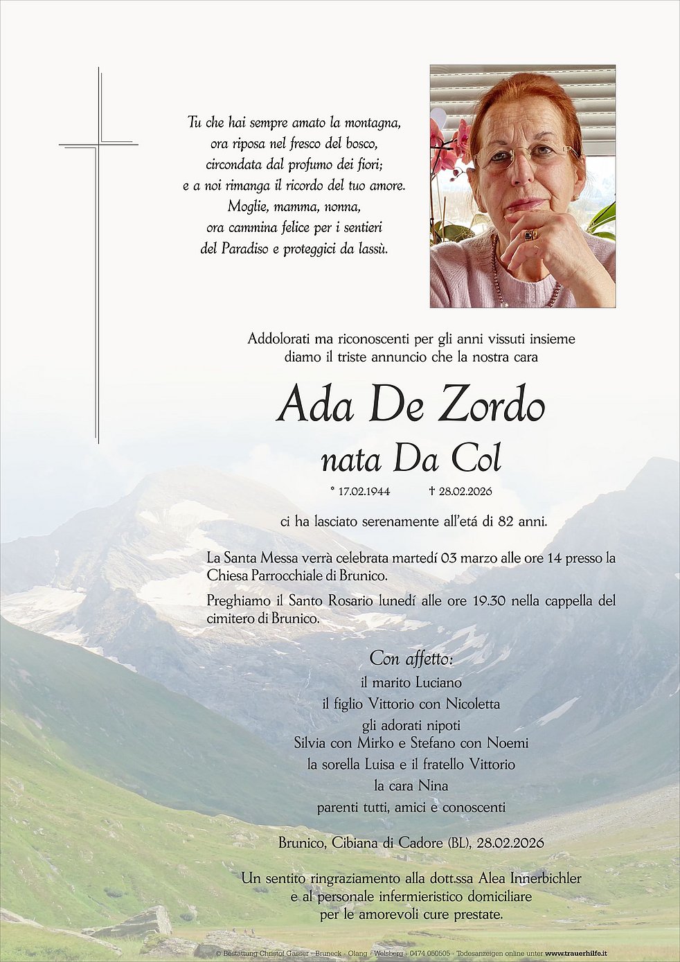La Santa Messa verrà celebrata martedí 03 marzo alle ore 14 presso la Chiesa Parrocchiale di Brunico.