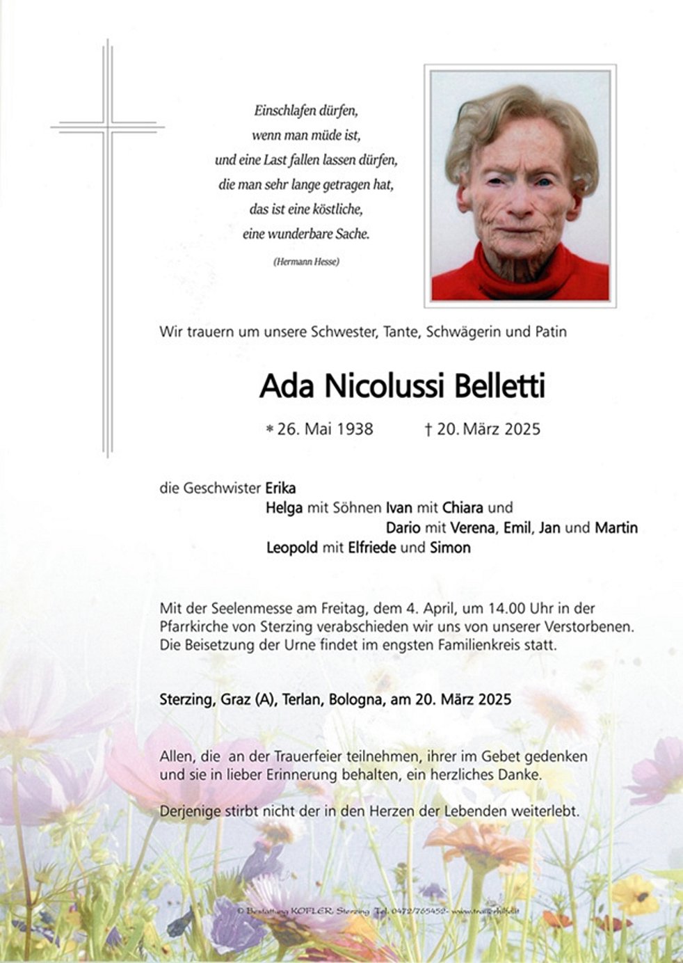 Mit der Seelenmesse am Freitag, dem 4. April, um 14.00 Uhr in der Pfarrkirche von Sterzing verabschieden wir uns von unserer Verstorbenen.