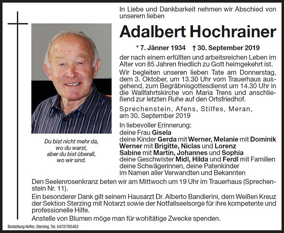 Wir begleiten unseren lieben Tate am Donnerstag, dem 3. Oktober, um 13.30 Uhr vom Trauerhaus ausgehend, zum Begräbnisgottesdienst um 14.30 Uhr in die Wallfahrtskirche von Maria Trens und anschließend zur letzten Ruhe auf den Ortsfriedhof.