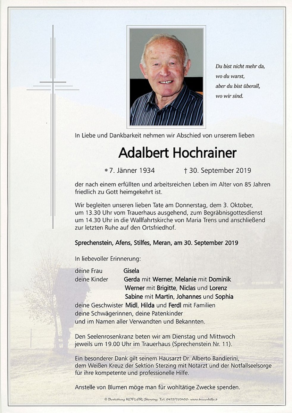 Ein besonderer Dank gilt seinem Hausarzt Dr. Alberto Bandierini, dem Weißen Kreuz der Sektion Sterzing mit Notarzt und der Notfallseelsorge für ihre kompetente und professionelle Hilfe.