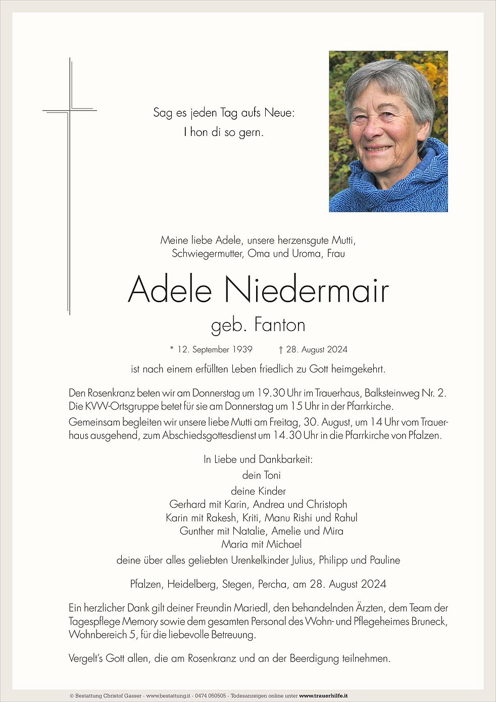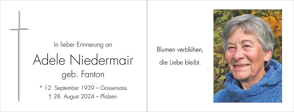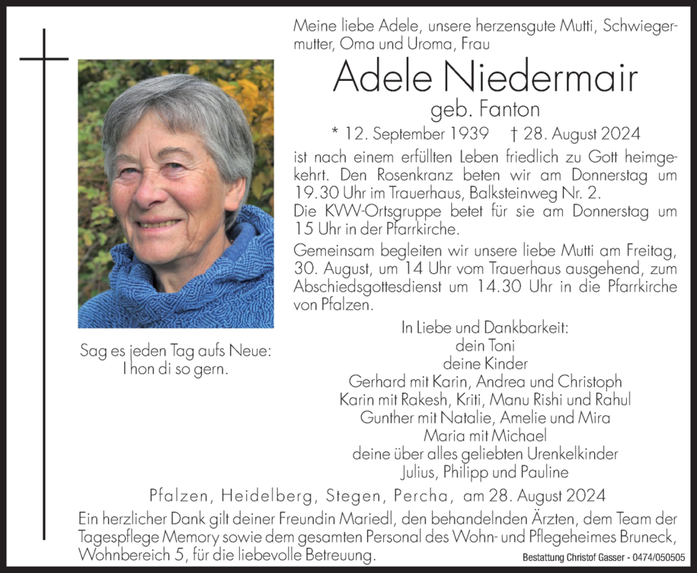 Gemeinsam begleiten wir unsere liebe Mutti am Freitag, 30. August, um 14 Uhr vom Trauerhaus ausgehend, zum Abschiedsgottesdienst um 14.30 Uhr in die Pfarrkirche von Pfalzen.