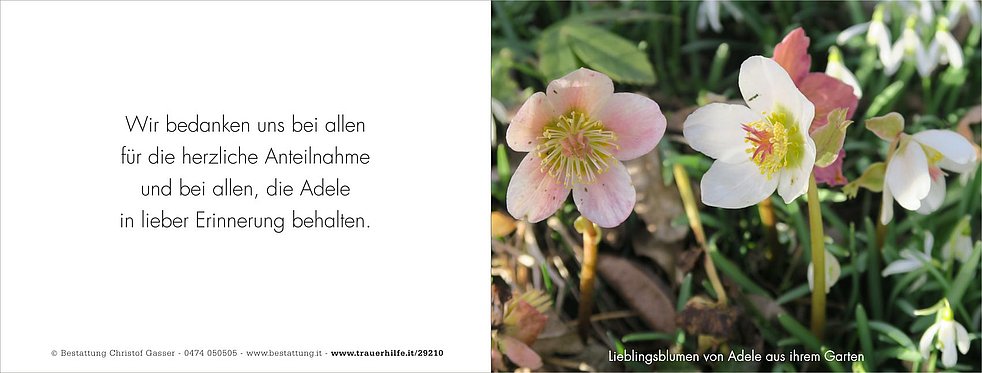 Ein herzlicher Dank gilt deiner Freundin Mariedl, den behandelnden Ärzten, dem Team der Tagespflege Memory sowie dem gesamten Personal des Wohn- und Pflegeheimes Bruneck, Wohnbereich 5, für die liebevolle Betreuung.