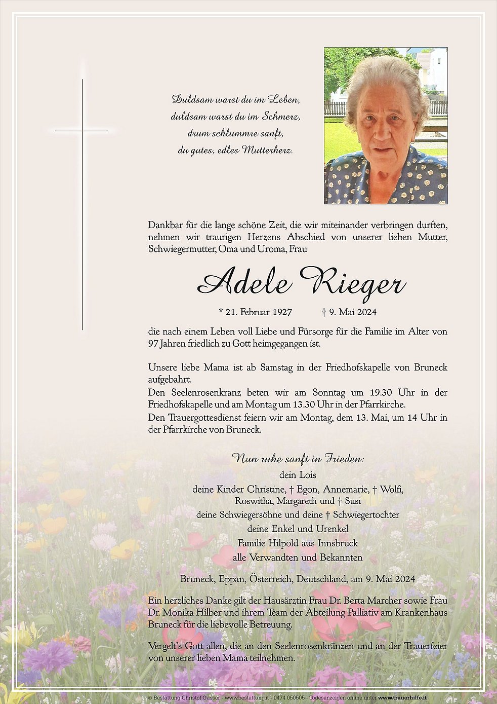 Unsere liebe Mama ist ab Samstag in der Friedhofskapelle von Bruneck aufgebahrt.