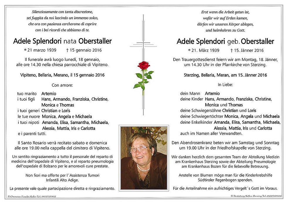 Anstelle von Blumen möge man für die Kinderkrebshilfe Südtiroler Regenbogen spenden.