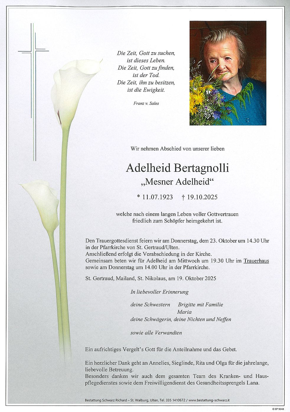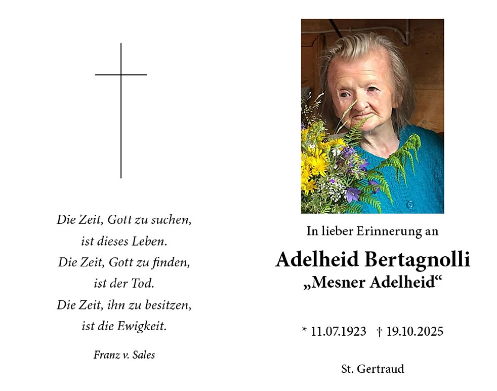 Den Trauergottesdienst feiern wir am Donnerstag, dem 23. Oktober um 14.30 Uhr in der Pfarrkirche von St. Gertraud/Ulten.