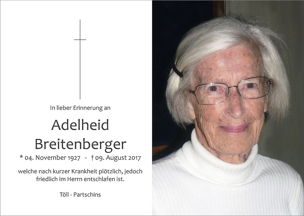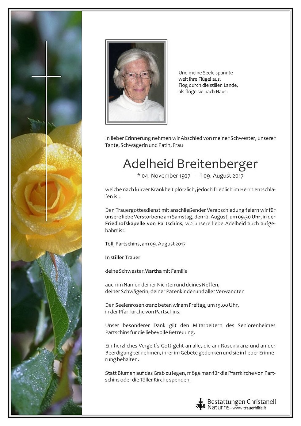 Den Trauergottesdienst mit anschließender Verabschiedung feiern wir für unsere liebe Verstorbene am Samstag, den 12. August, um 09.30 Uhr, in der Friedhofskapelle von Partschins, wo unsere liebe Adelheid auch aufgebahrt ist.