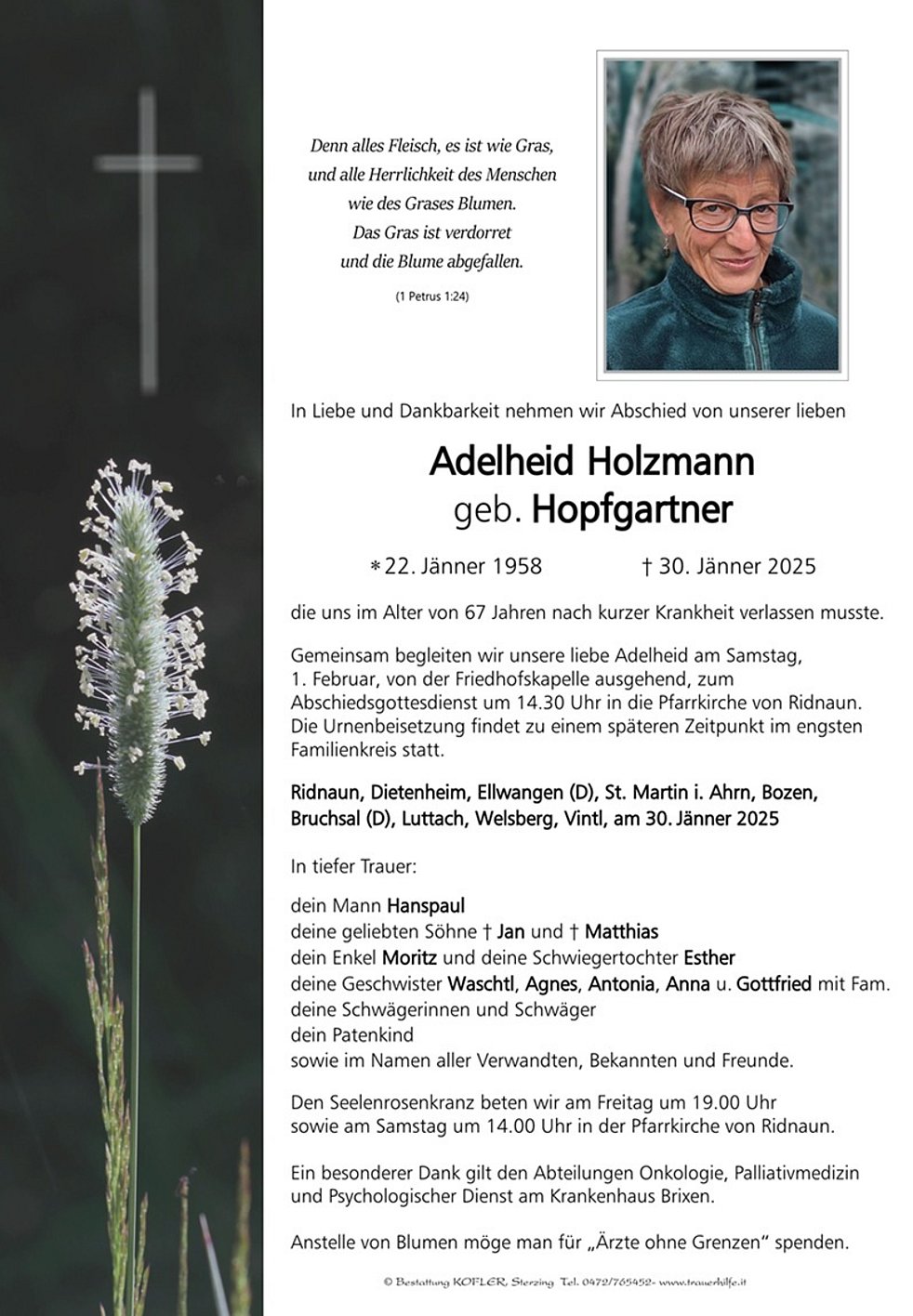 Gemeinsam begleiten wir unsere liebe Adelheid am Samstag, 1. Februar, von der Friedhofskapelle ausgehend, zum Abschiedsgottesdienst um 14.30 Uhr in die Pfarrkirche von Ridnaun. Die Urnenbeisetzung findet zu einem späteren Zeitpunkt im engsten Familienkreis statt.