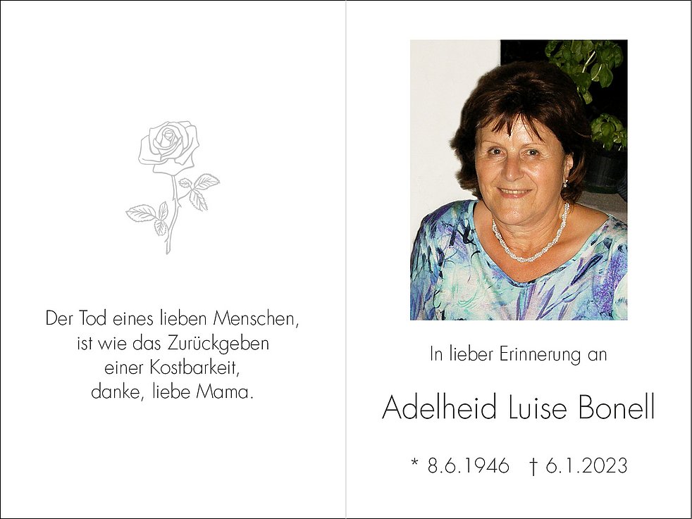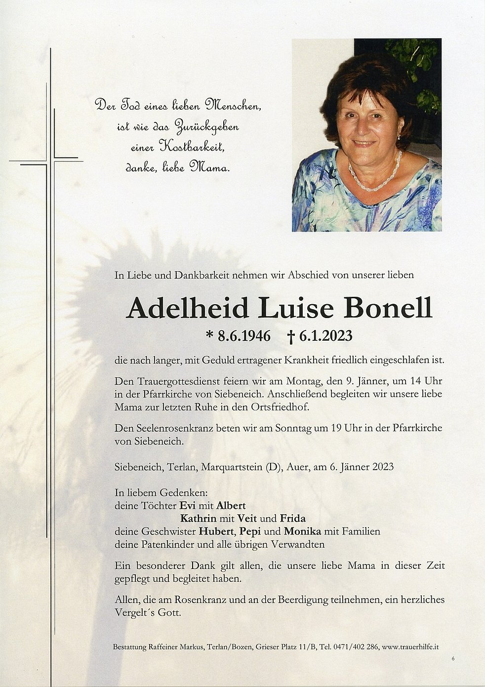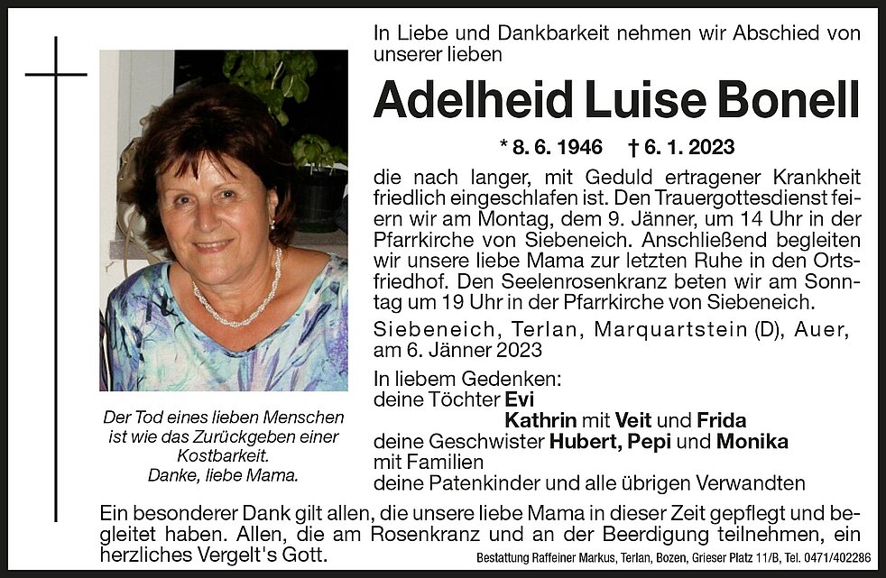 Den Trauergottesdienst feiern wir am Montag, den 9. Jänner, um 14.00 Uhr in der Pfarrkirche von Siebeneich. Anschließend begleiten wir unsere liebe Mama zur letzten Ruhe in den Ortsfriedhof.
