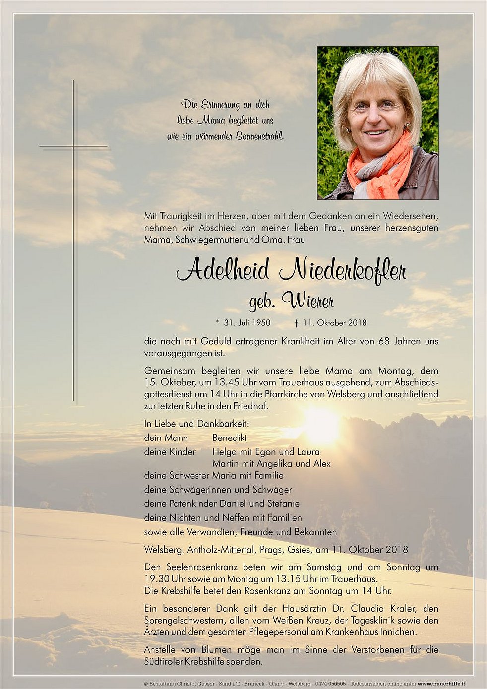 Gemeinsam begleiten wir unsere liebe Mama am Montag, dem 15. Oktober, um 13.45 Uhr vom Trauerhaus ausgehend, zum Abschiedsgottesdienst um 14 Uhr in die Pfarrkirche von Welsberg und anschließend zur letzten Ruhe in den Friedhof.
