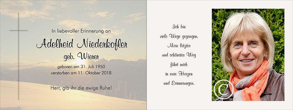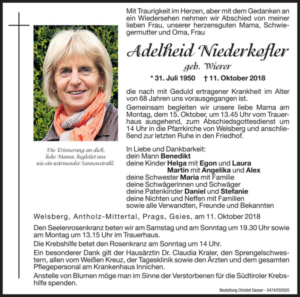 Anstelle von Blumen möge man im Sinne der Verstorbenen für die Südtiroler Krebshilfe spenden.