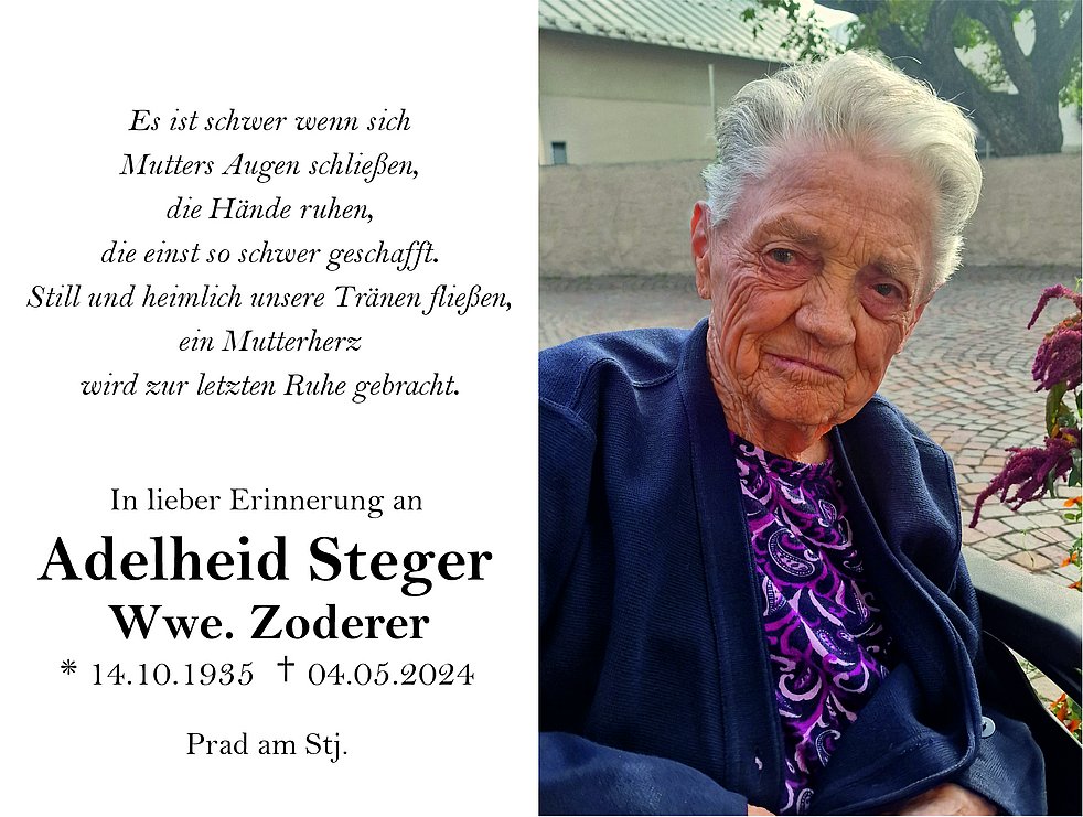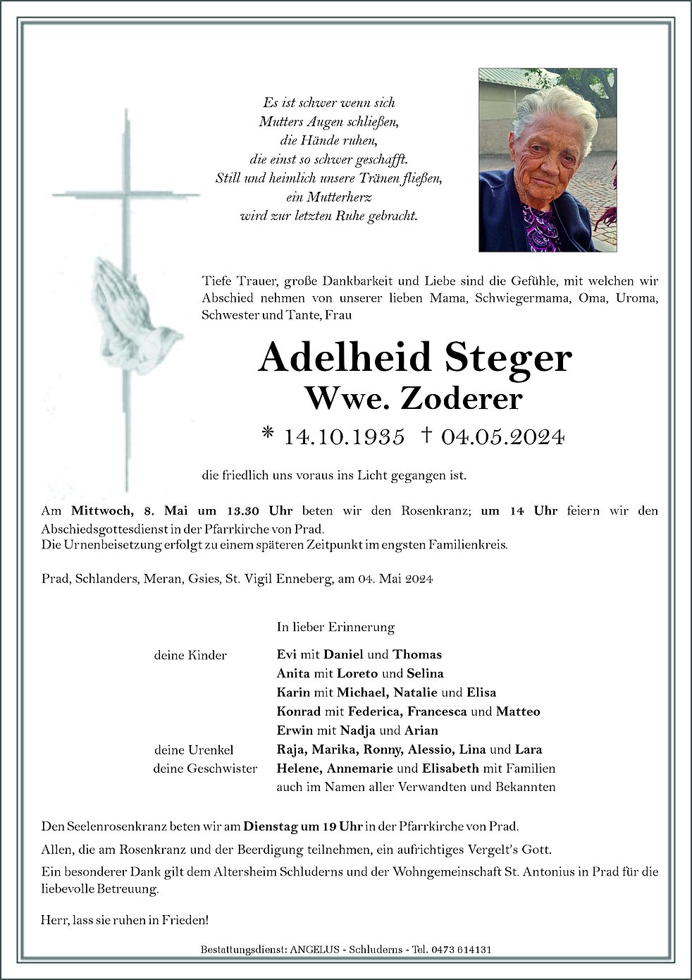 Deine Stimme, so vertraut, schweigt. Deine Nähe, so gewohnt, ist nicht mehr. Du fehlst! Was bleibt, sind dankbare Erinnerungen! Pfieti Adelheid Ruhe in Frieden! Deine Schwestern Helene Annemaria und Elisabeth