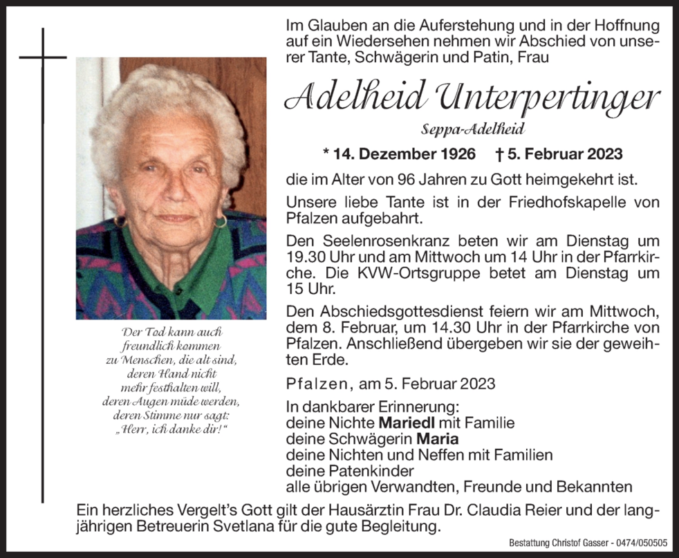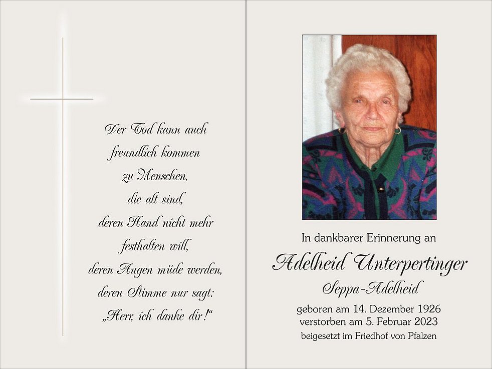 Den Abschiedsgottesdienst feiern wir am Mittwoch, dem 8. Februar, um 14.30 Uhr in der Pfarrkirche von Pfalzen. Anschließend übergeben wir sie der geweihten Erde.