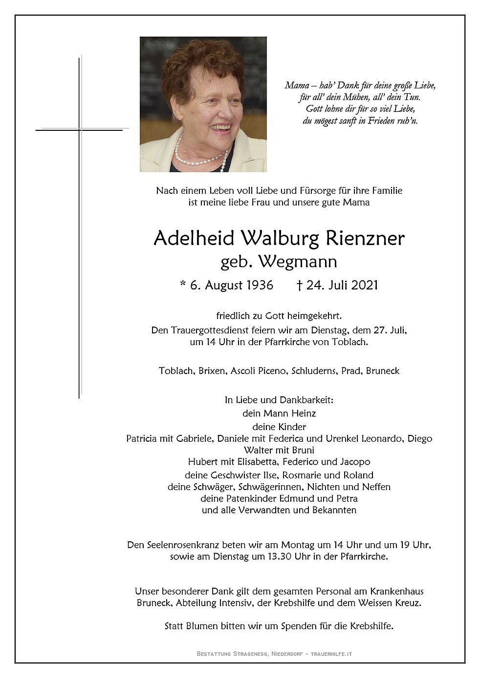 Den Trauergottesdienst feiern wir am Dienstag, dem 27. Juli, um 14 Uhr in der Pfarrkirche von Toblach.
