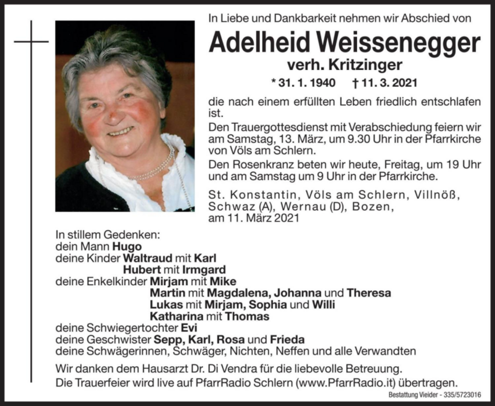 Den Trauergottesdienst mit Verabschiedung feiern wir am Samstag, 13. März, um 9.30 Uhr in der Pfarrkirche von Völs am Schlern .