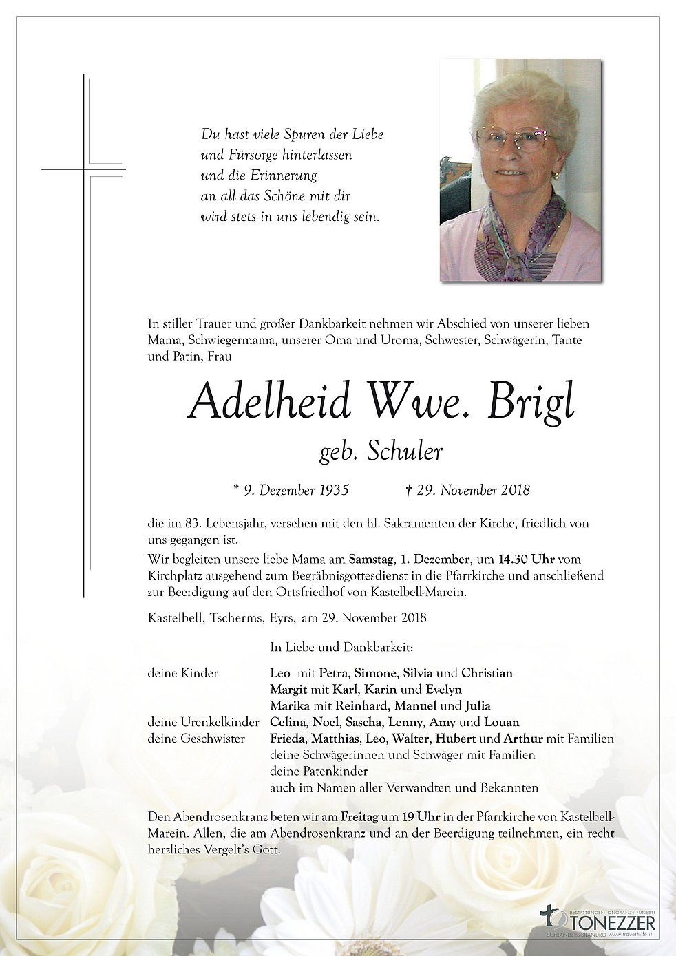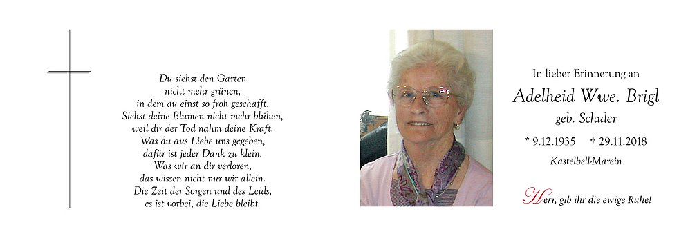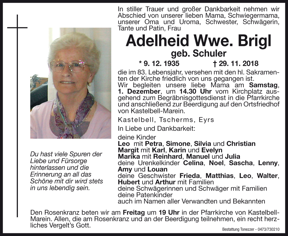 Wir begleiten unsere liebe Mama am Samstag, 1. Dezember, um 14.30 Uhr vom Kirchplatz ausgehend zum Begräbnisgottesdienst in die Pfarrkirche und anschließend zur Beerdigung auf den Ortsfriedhof von Kastelbell-Marein.