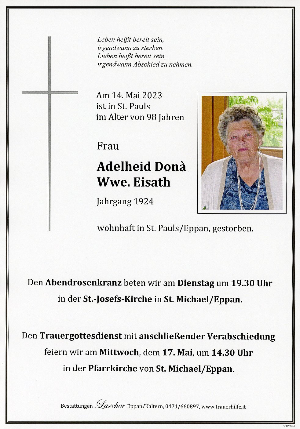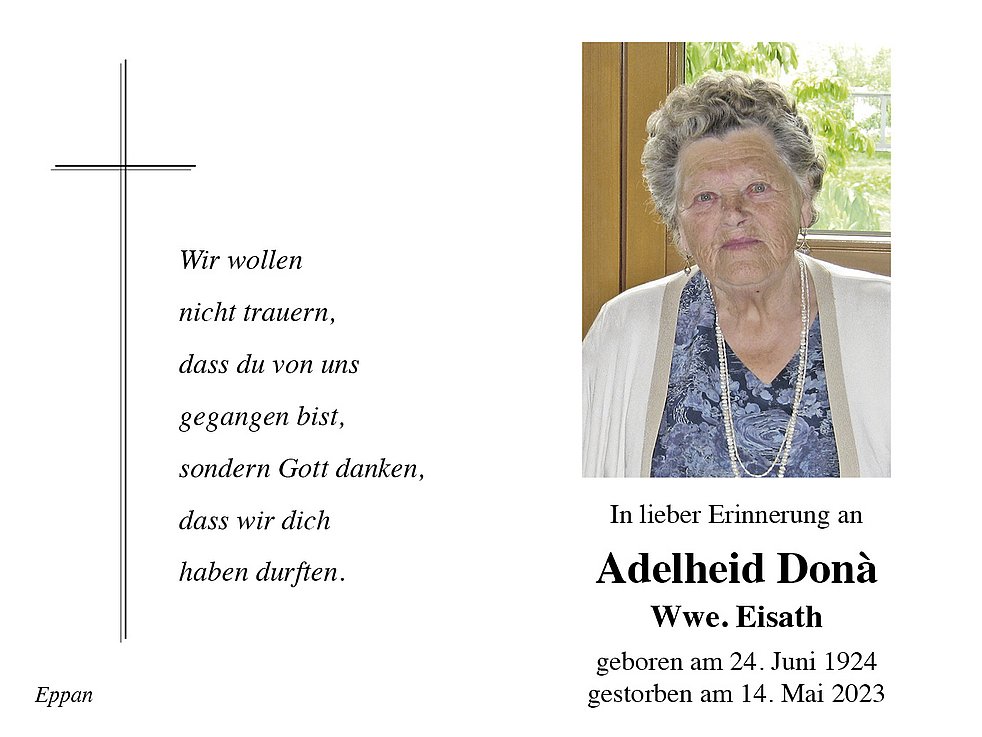 Den Trauergottesdienst mit anschließender Verabschiedung feiern wir am Mittwoch dem 17. Mai um 14.30 Uhr in der Pfarrkirche von St. Michael/Eppan.