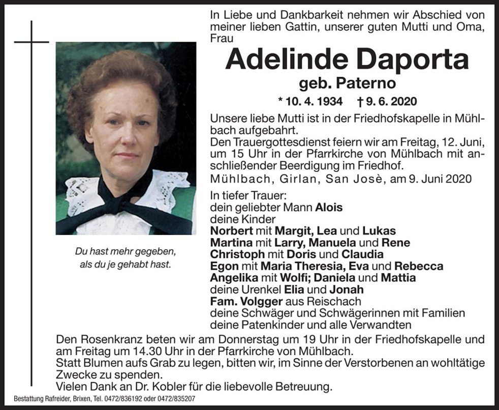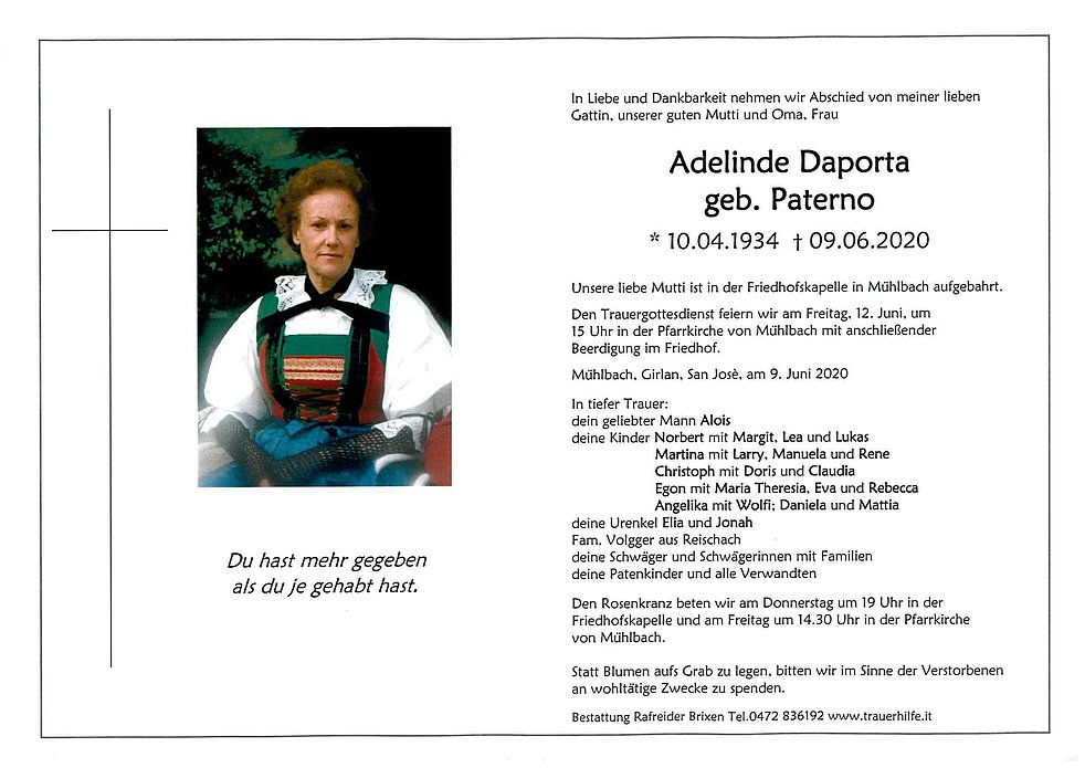 Den Trauergottesdienst feiern wir am Freitag, 12. Juni, um 15 Uhr in der Pfarrkirche von Mühlbach mit anschließender Beerdigung im Friedhof.