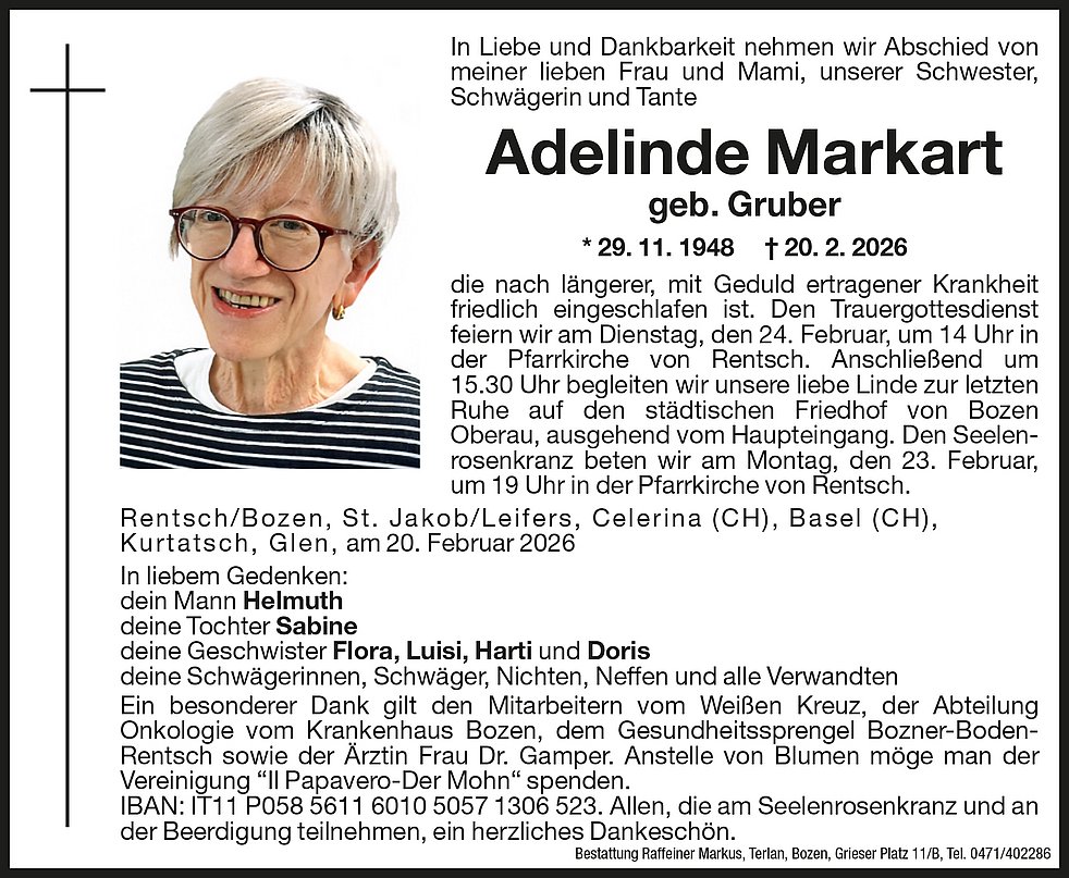 Den Trauergottesdienst feiern wir am Dienstag, den 24. Februar, um 14 Uhr in der Pfarrkirche von Rentsch. Anschließend um 15.30 Uhr begleiten wir unsere liebe Linde zur letzten Ruhe auf den städtischen Friedhof von Bozen Oberau, ausgehend vom Haupteingang.