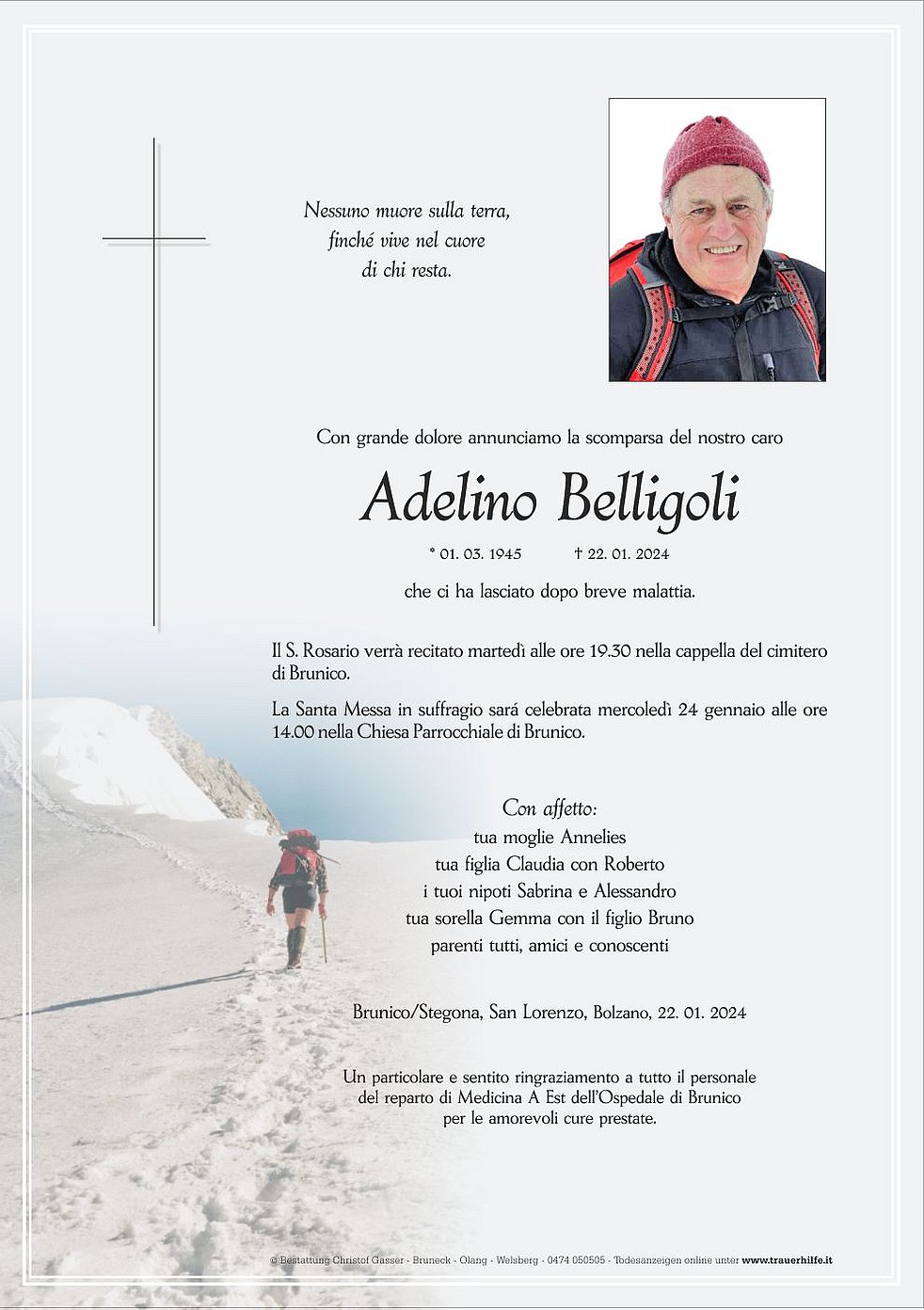 La Santa Messa in suffragio sará celebrata mercoledì 24 gennaio alle ore 14.00 nella Chiesa Parrocchiale di Brunico.