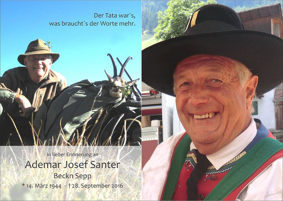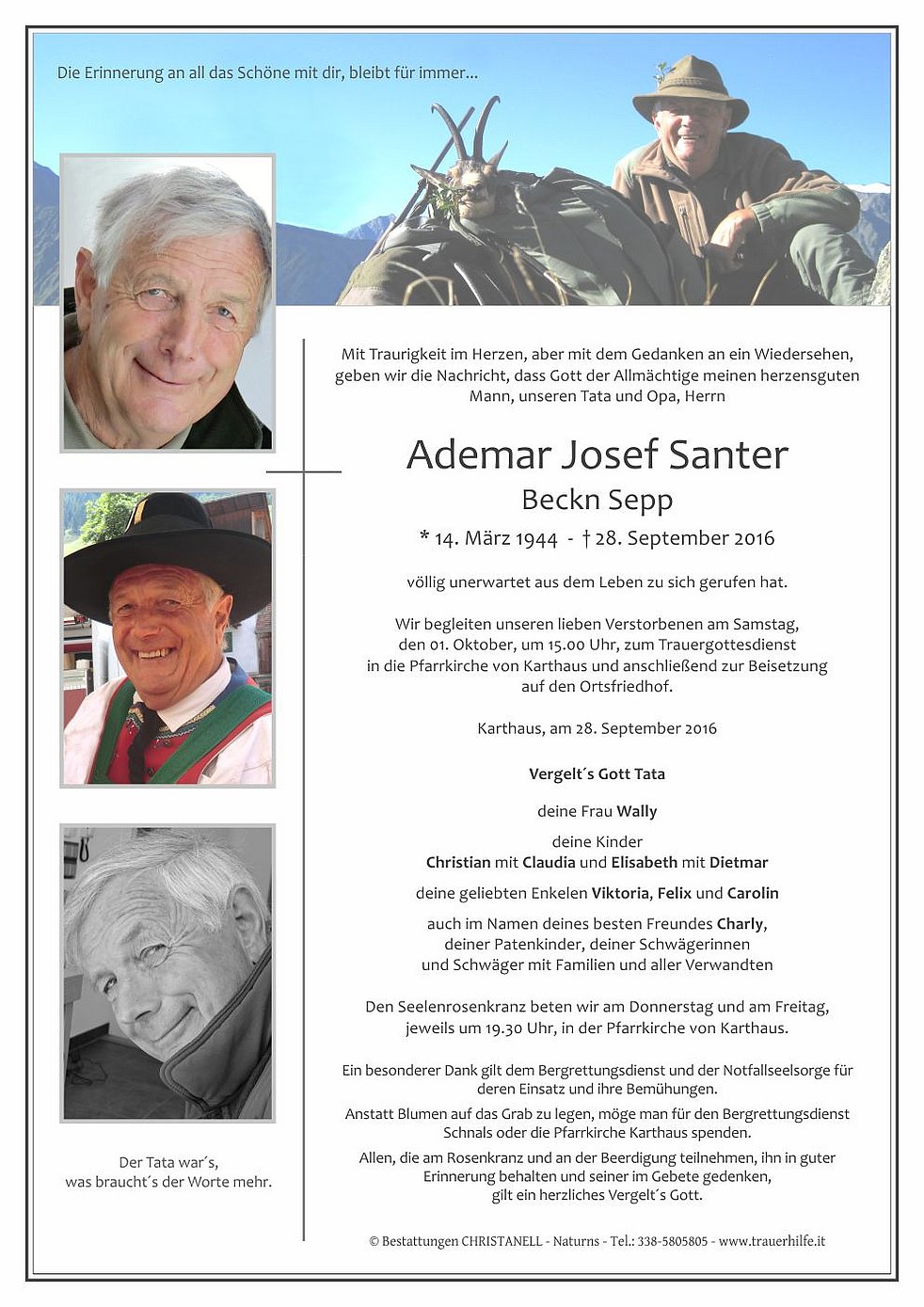 Anstatt Blumen auf das Grab zu legen, möge man für den Bergrettungsdienst Schnals oder die Pfarrkirche Karthaus spenden.