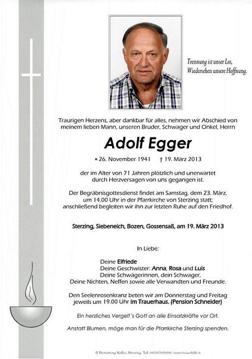 Anstatt Blumen, möge man für die Pfarrkirche Sterzing spenden.