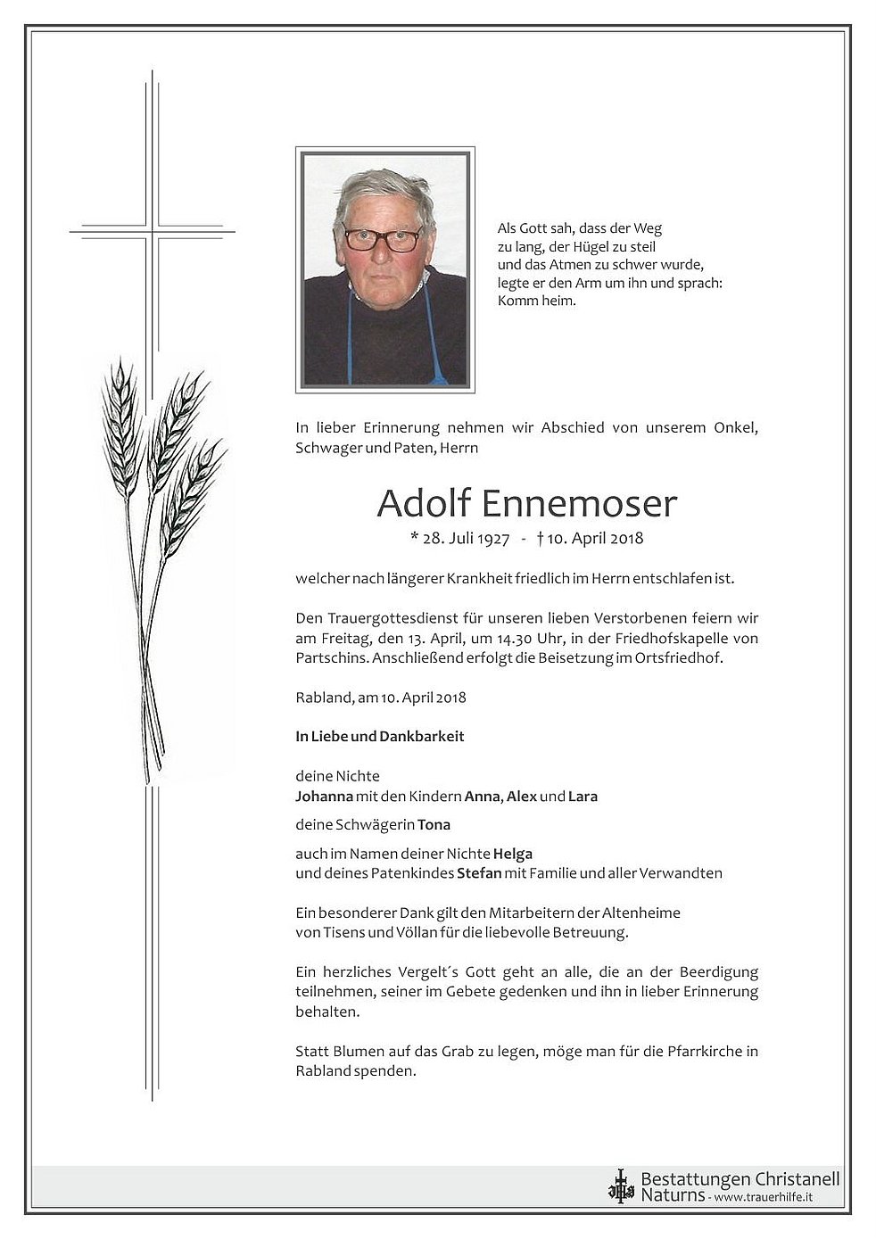 Den Trauergottesdienst für unseren lieben Verstorbenen feiern wir am Freitag, den 13. April, um 14.30 Uhr, in der Friedhofskapelle von Partschins. Anschließend erfolgt die Beisetzung im Ortsfriedhof.