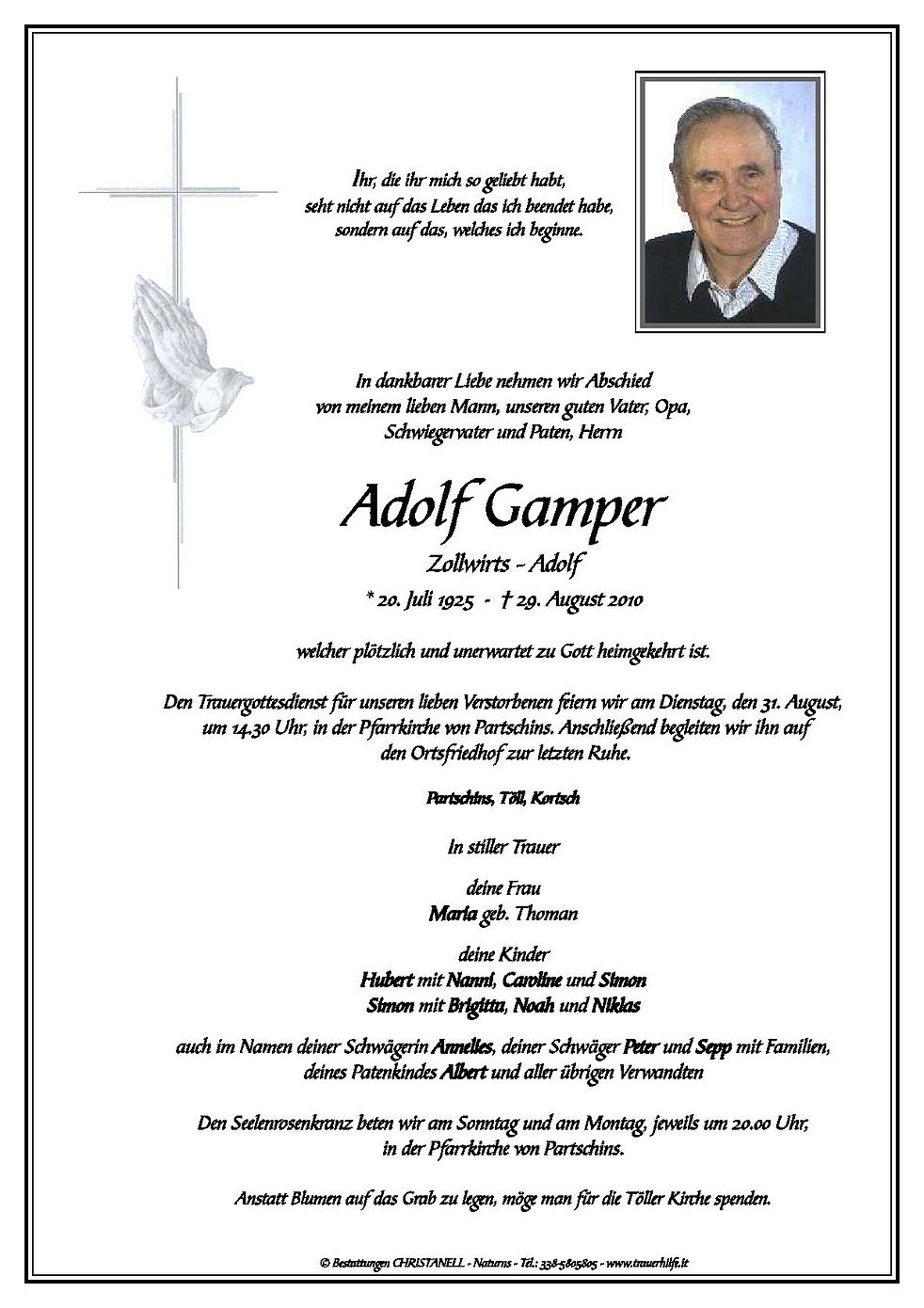 Den Trauergottesdienst für unseren lieben Verstorbenen feiern wir am Dienstag, den 31. August, um 14.30 Uhr, in der Pfarrkirche von Partschins. Anschließend begleiten wir ihn auf den Ortsfriedhof zur letzten Ruhe.