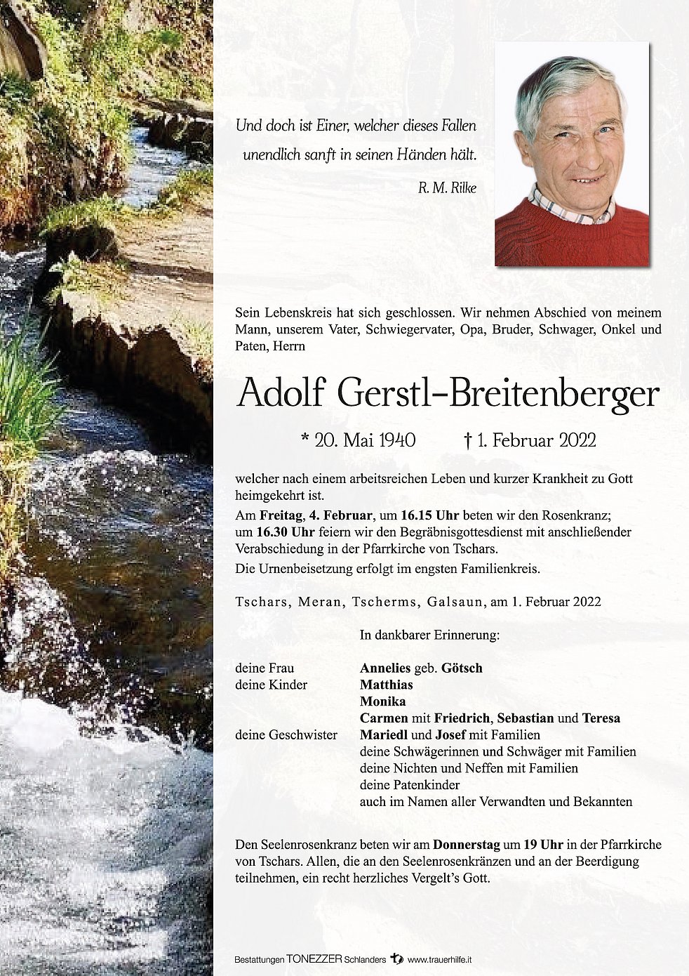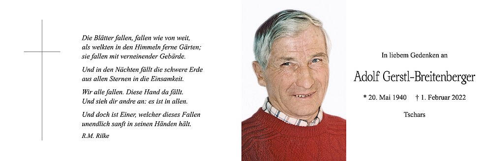 Am Freitag, 4. Februar, um 16.15 Uhr beten wir den Rosenkranz; um 16.30 Uhr feiern wir den Begräbnisgottesdienst mit anschließender Verabschiedung in der Pfarrkirche von Tschars.