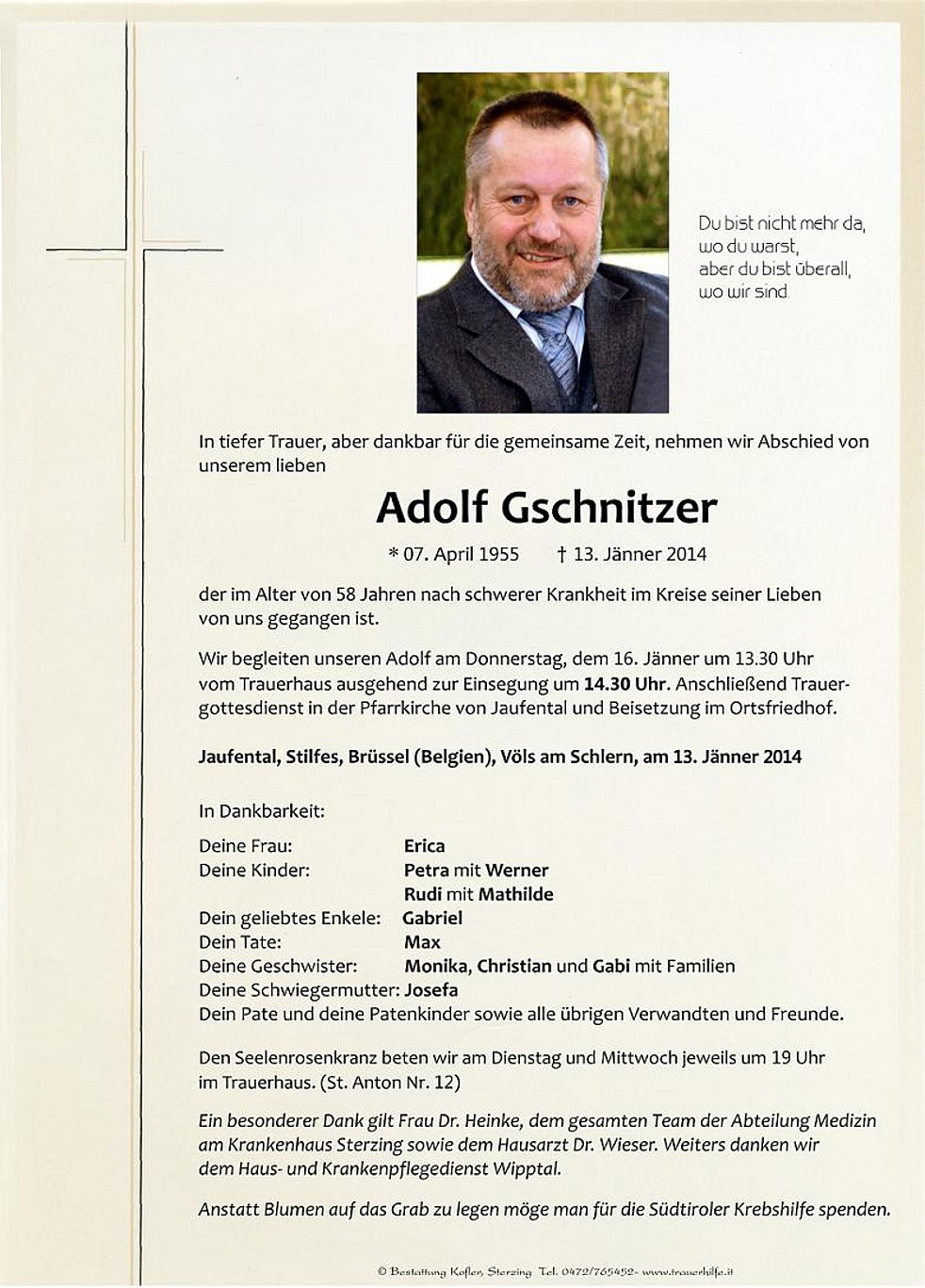 Anstatt Blumen auf das Grab zu legen möge man für die Südtiroler Krebshilfe spenden.