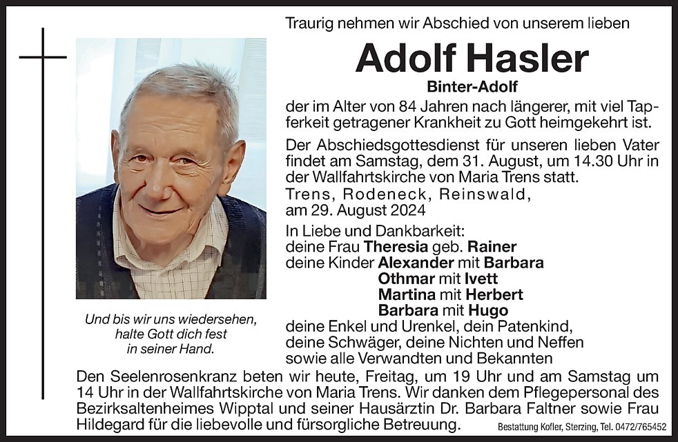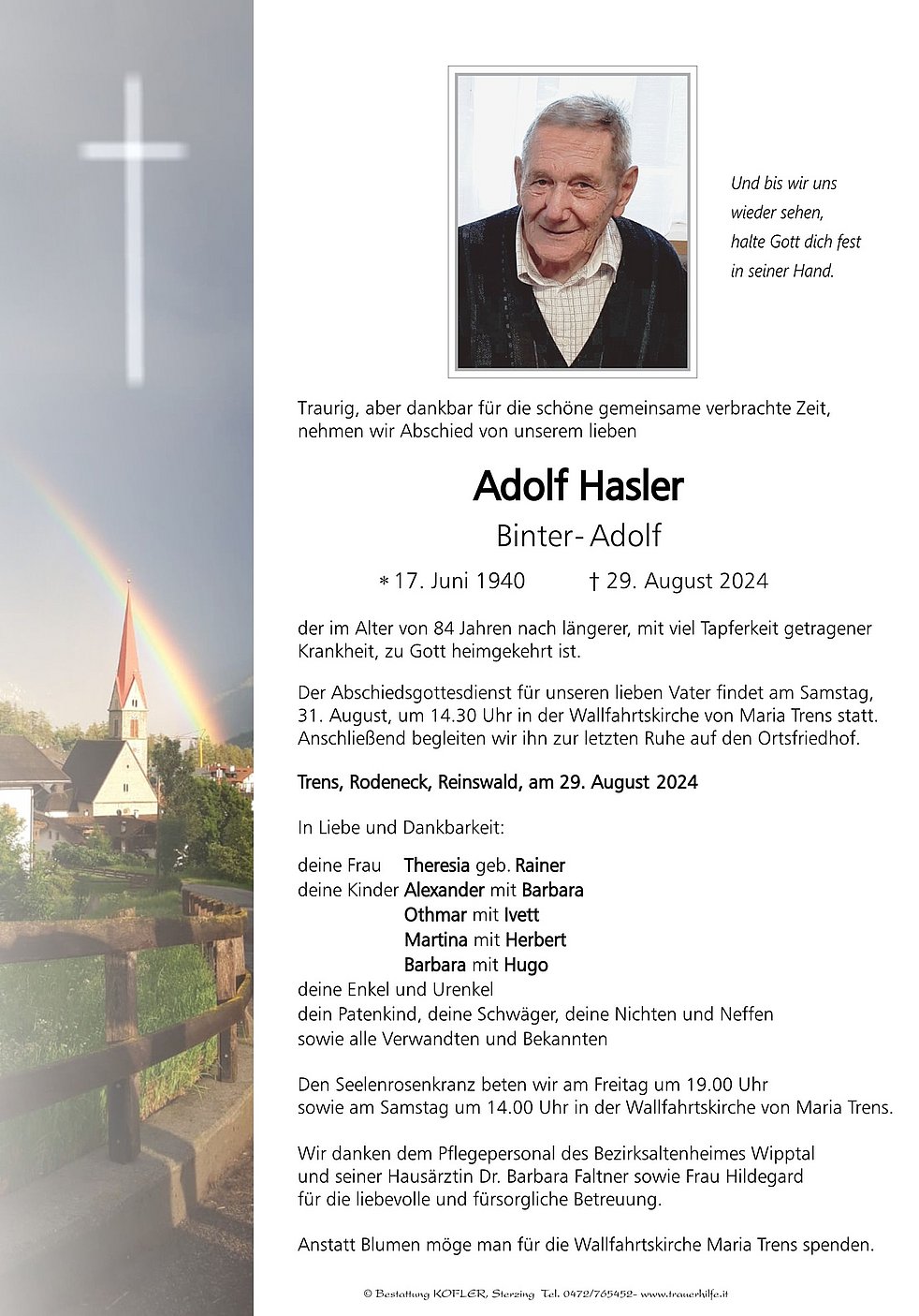Der Abschiedsgottesdienst für unseren lieben Vater findet am Samstag, 31. August, um 14.30 Uhr in der Wallfahrtskirche von Maria Trens statt. Anschließend begleiten wir ihn zur letzten Ruhe auf den Ortsfriedhof.
