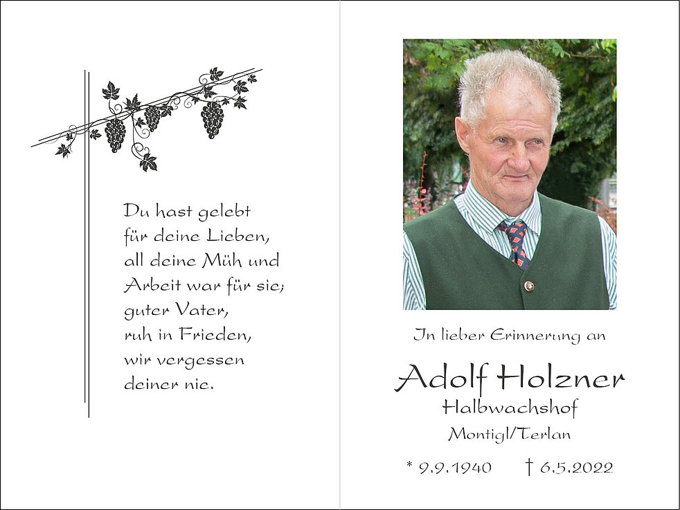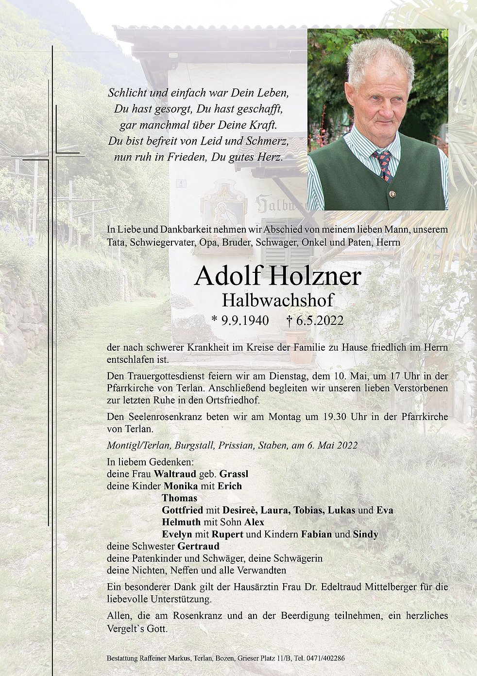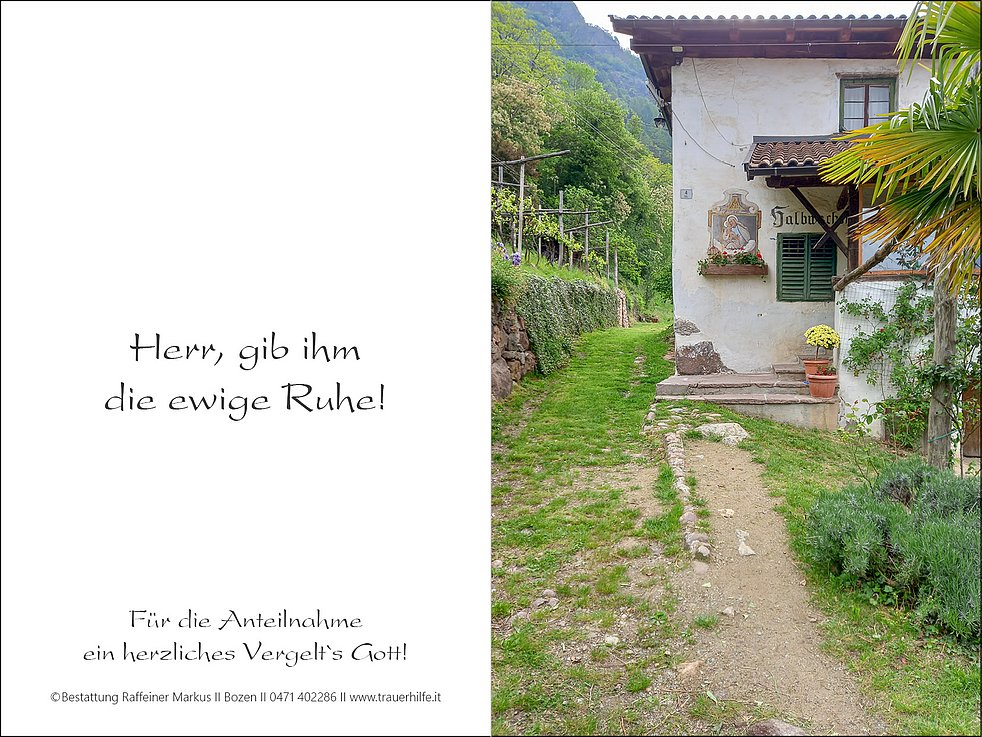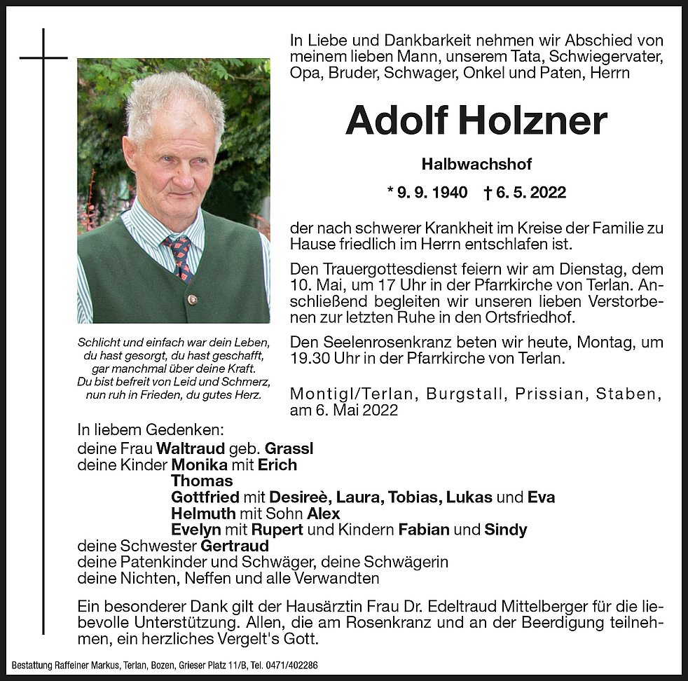 Den Trauergottesdienst feiern wir am Dienstag, dem 10. Mai, um 17 Uhr in der Pfarrkirche von Terlan. Anschließend begleiten wir unseren lieben Verstorbenen zur letzten Ruhe in den Ortsfriedhof.