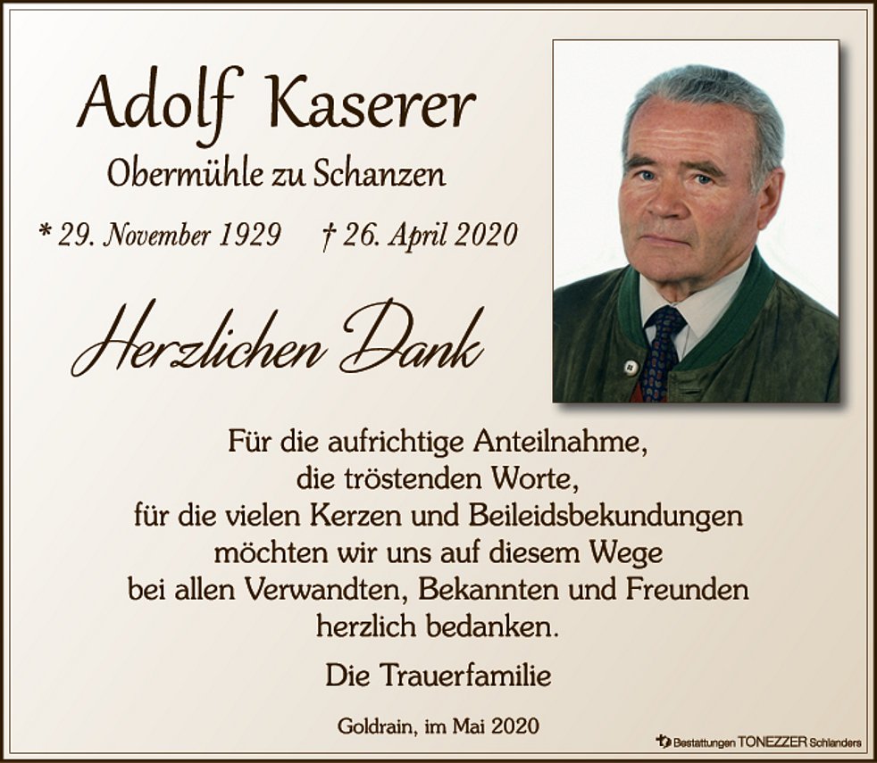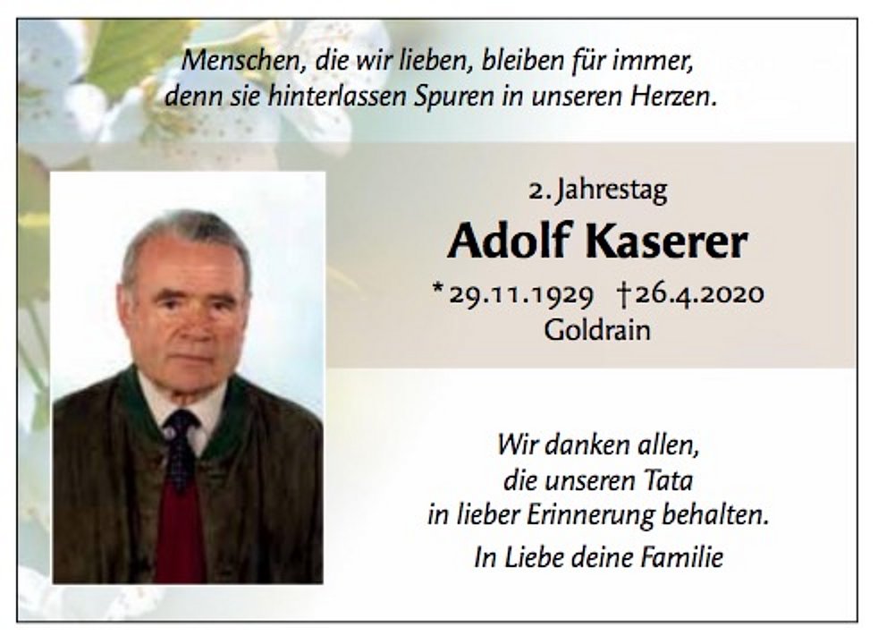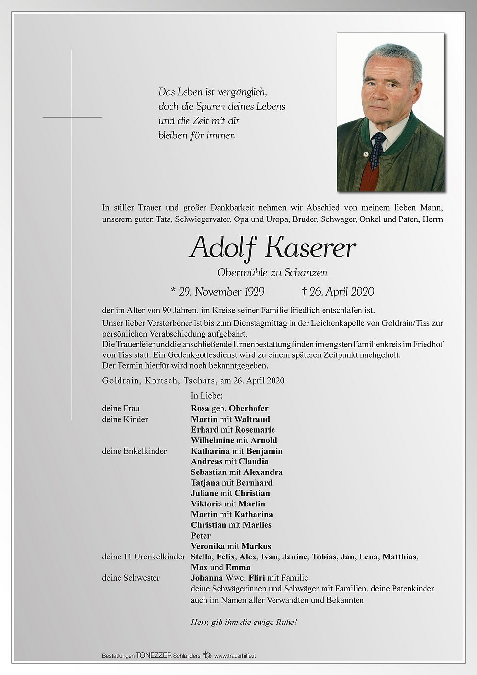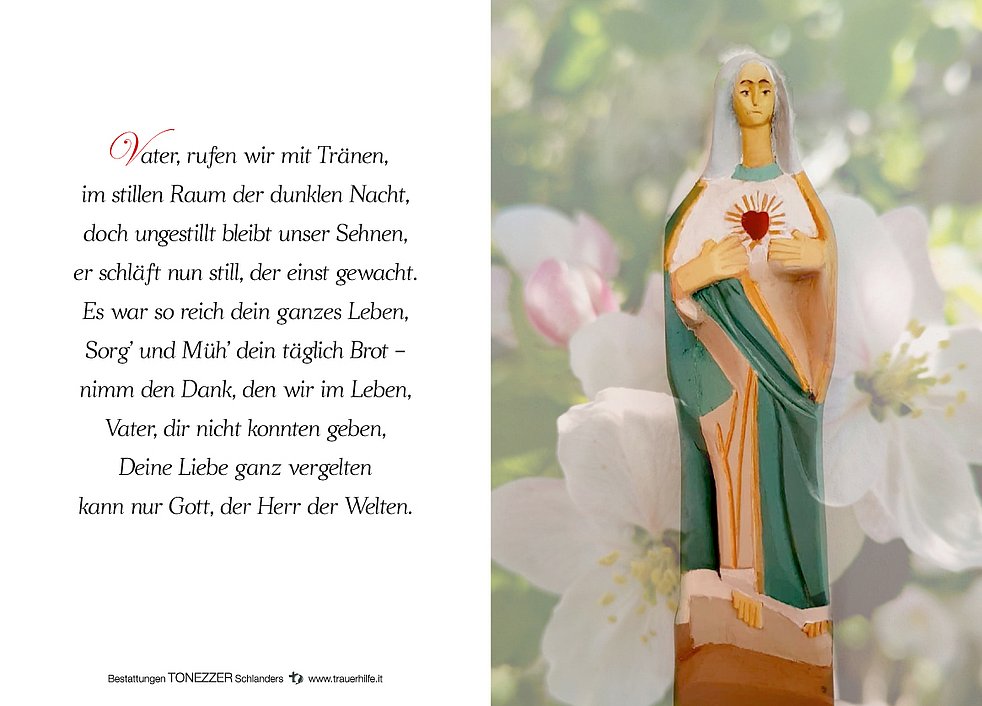 Unser lieber Verstorbener ist bis zum Dienstagmittag in der Leichenkapelle von Goldrain/Tiss zur persönlichen Verabschiedung aufgebahrt. Die Trauerfeier und die anschließende Urnenbestattung finden im engsten Familienkreis im Friedhof von Tiss statt. Ein Gedenkgottesdienst wird zu einem späteren Zeitpunkt nachgeholt. Der Termin hierfür wird noch bekanntgegeben.