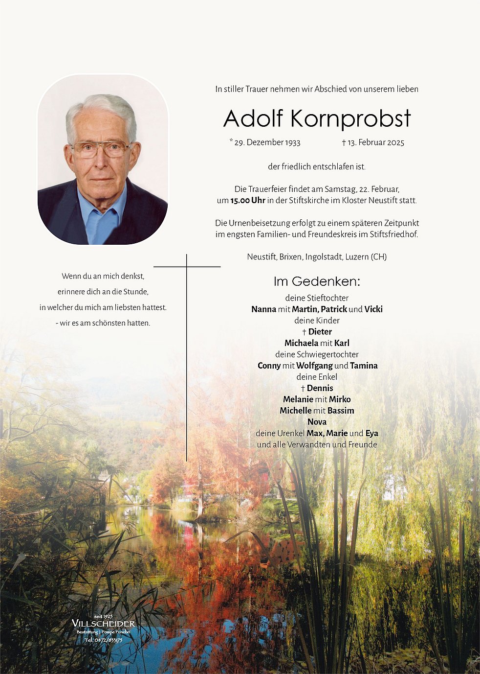 Trauerfeier: 22.02. - 15:00 Uhr Neustift