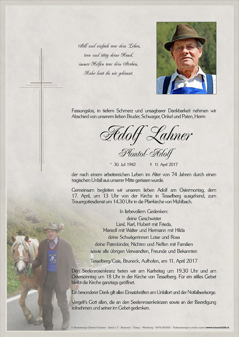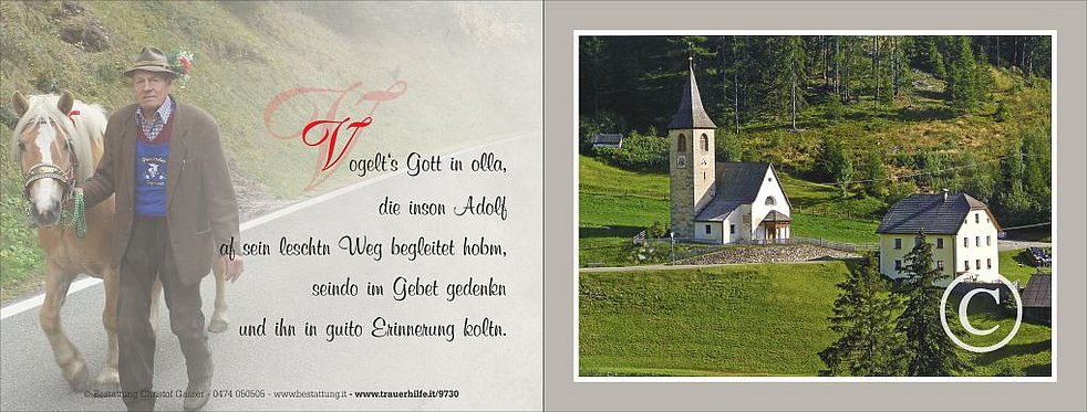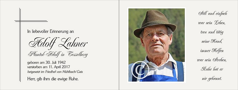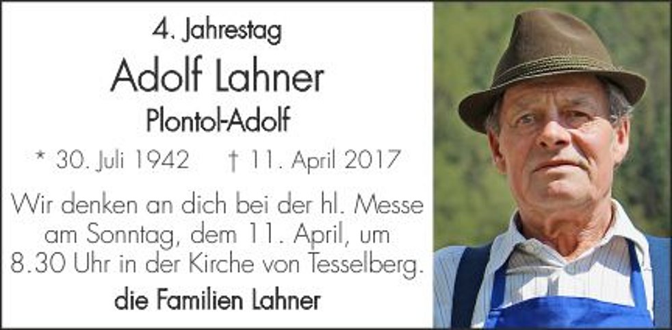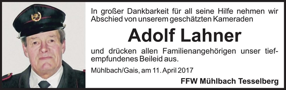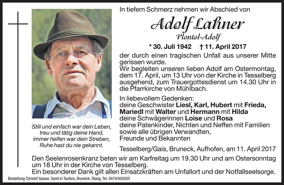 Gemeinsam begleiten wir unseren lieben Adolf am Ostermontag, dem 17. April, um 13 Uhr von der Kirche in Tesselberg ausgehend, zum Trauergottesdienst um 14.30 Uhr in die Pfarrkirche von Mühlbach.