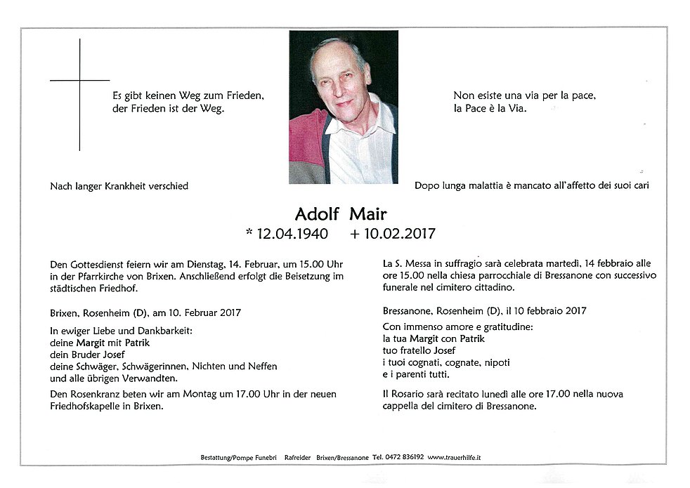 Den Gottesdienst feiern wir am Dienstag, 14. Februar, um 15.00 Uhr in der Pfarrkirche von Brixen. Anschließend erfolgt die Beisetzung im städtischen Friedhof.