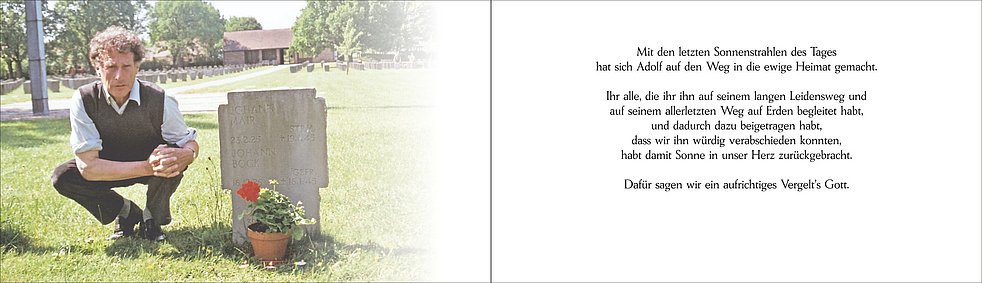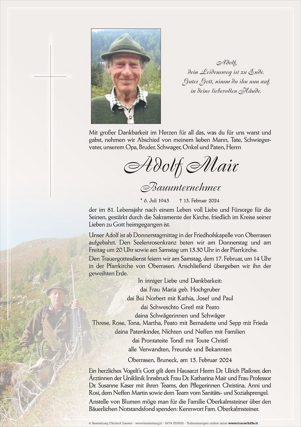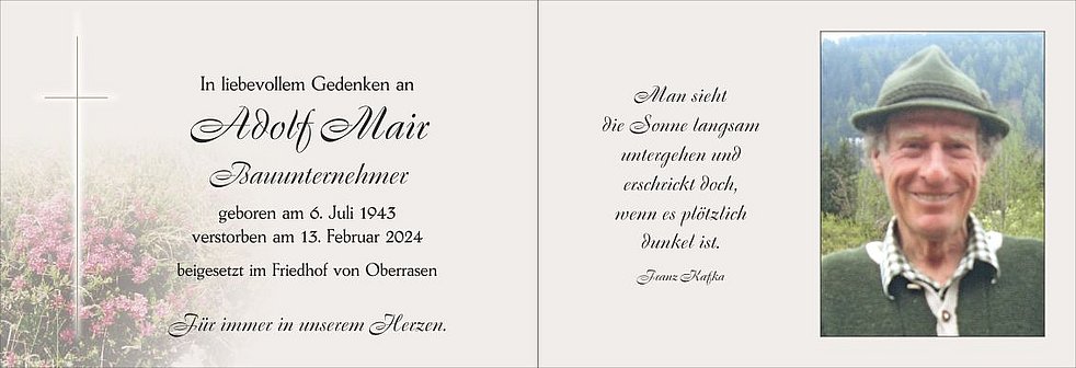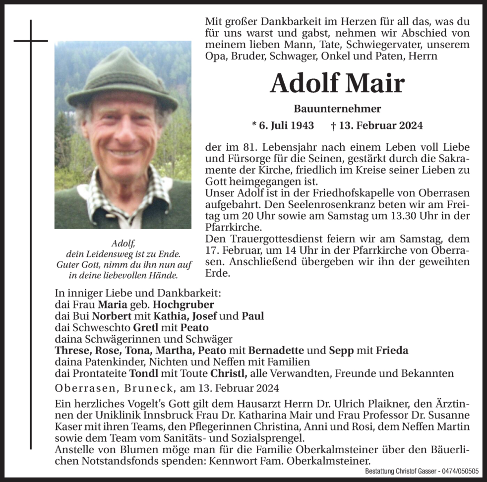 Unser Adolf ist ab Donnerstagmittag in der Friedhofskapelle von Oberrasen aufgebahrt. Den Seelenrosenkranz beten wir am Donnerstag und am Freitag um 20 Uhr sowie am Samstag um 13.30 Uhr in der Pfarrkirche.