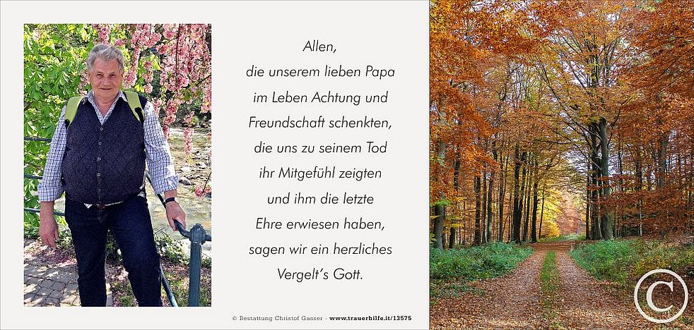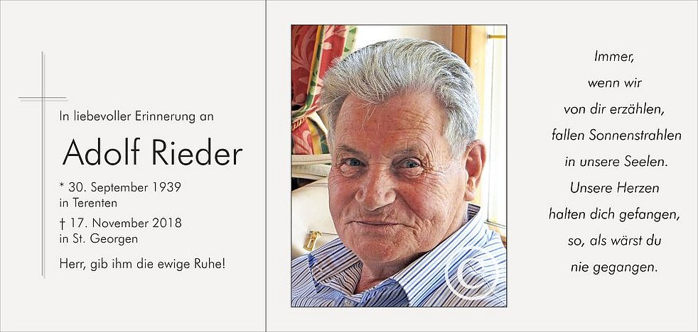 Gemeinsam begleiten wir unseren lieben Papa am Mittwoch, dem 21. November, von der Friedhofskapelle ausgehend, auf seinem letzten Weg zum Abschiedsgottesdienst um 13.45 Uhr in die Dreifaltigkeitskirche von St. Georgen. Anschließend übergeben wir ihn der geweihten Erde.