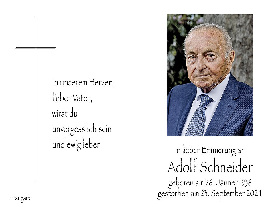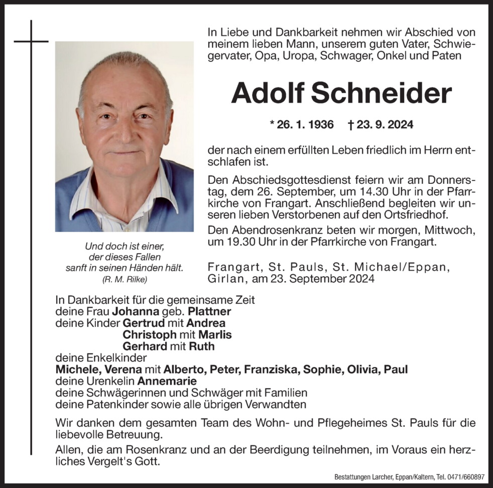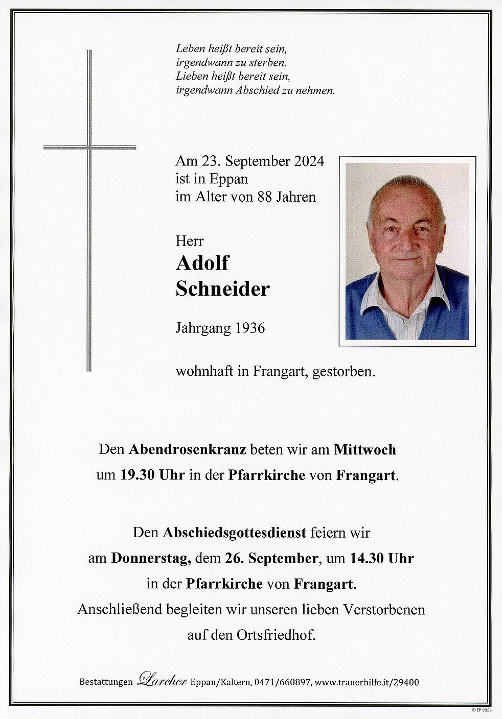 Den Abschiedsgottesdienst feiern wir am Donnerstag, dem 26. September um 14.30 Uhr in der Pfarrkirche von Frangart. Anschließend begleiten wir unseren lieben Verstorbenen auf den Ortsfriedhof.
