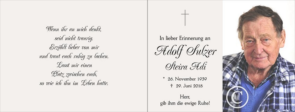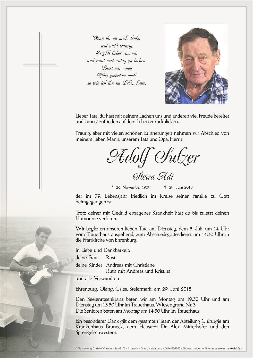 Wir begleiten unseren lieben Tata am Dienstag, dem 3. Juli, um 14 Uhr vom Trauerhaus ausgehend, zum Abschiedsgottesdienst um 14.30 Uhr in die Pfarrkirche von Ehrenburg.