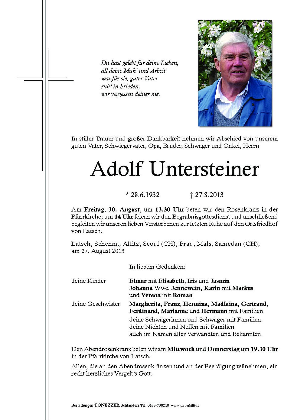 Am Freitag, 30. August, um 13.30 Uhr beten wir den Rosenkranz in der Pfarrkirche; um 14 Uhr feiern wir den Begräbnisgottesdienst und anschließend begleiten wir unseren lieben Verstorbenen zur letzten Ruhe auf den Ortsfriedhof von Latsch.