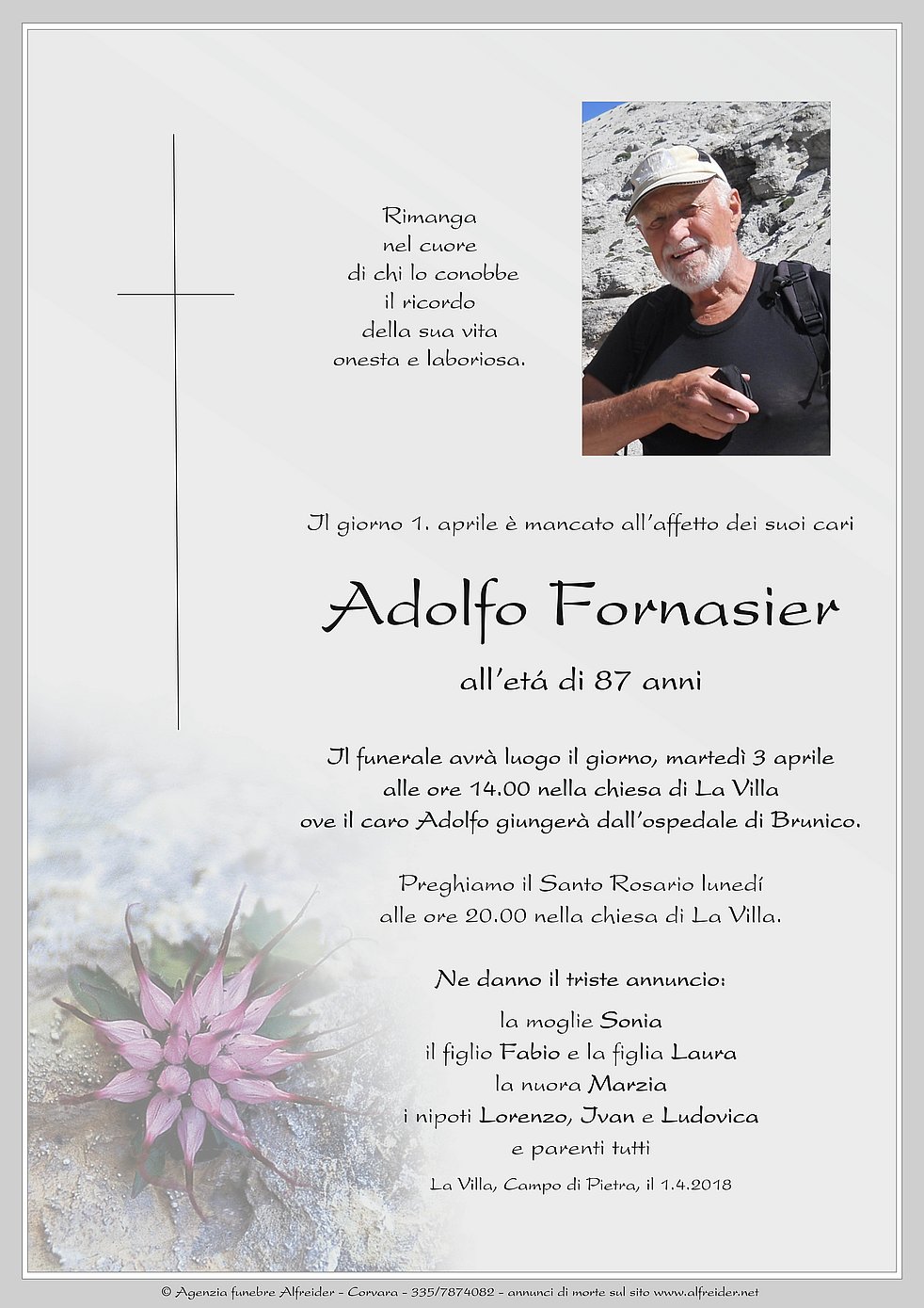 Il funerale avrà luogo il giorno, martedì 3 aprile alle ore 14.00 nella chiesa di La Villa ove il caro Adolfo giungerà dall’ospedale di Brunico.