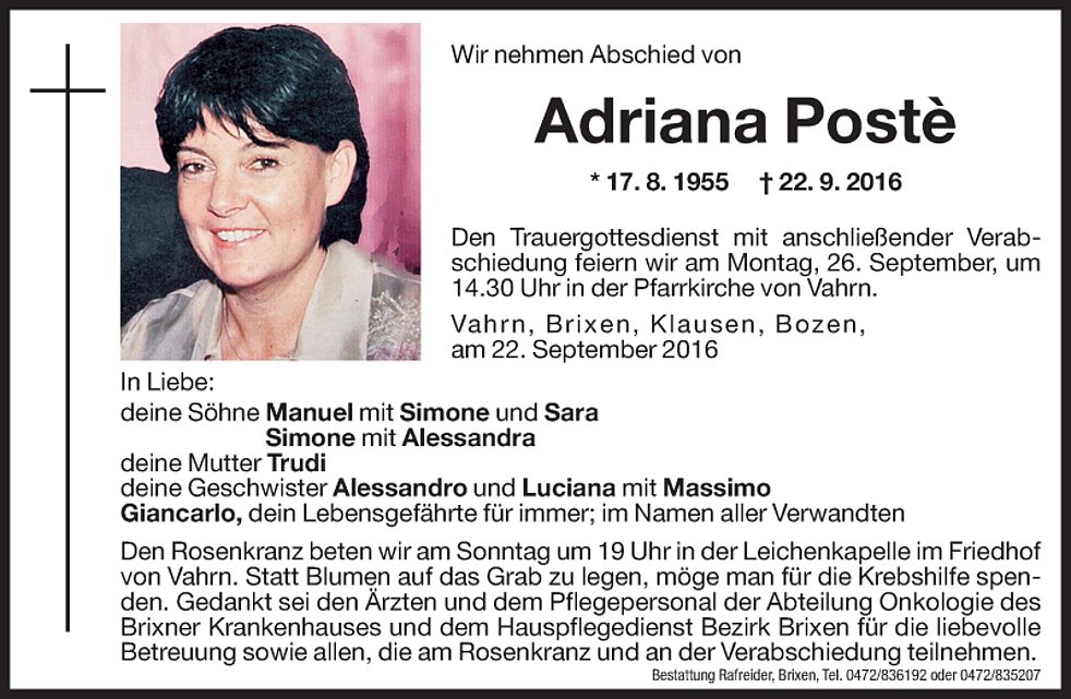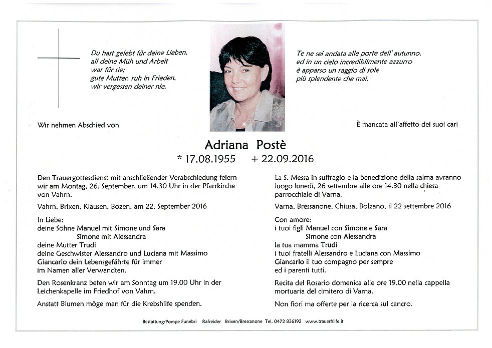 Gedankt sei den Ärzten und dem Pflegepersonal der Abteilung Onkologie des Brixner Krankenhauses und dem Hauspflegedienst Bezirk Brixen für die liebevolle Betreuung, sowie allen die am Rosenkranz und an der Verabschiedung teilnehmen.
