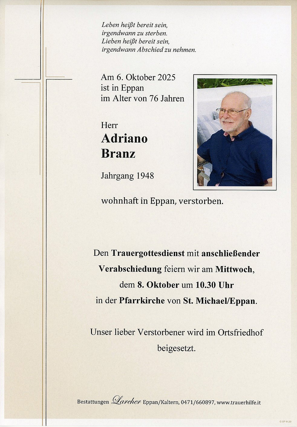 Den Trauergottesdienst mit anschließender Verabschiedung feiern wir am Mittwoch, dem 8. Oktober um 10.30 Uhr in der Pfarrkirche von St. Michael/Eppan.