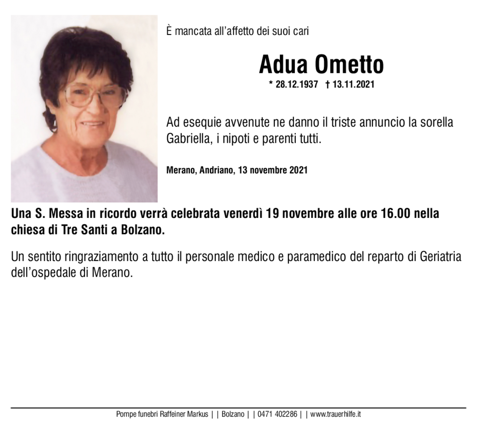 Una S. Messa in ricordo verrà celebrata venerdì 19 novembre alle ore 16.00 nella chiesa di Tre Santi a Bolzano.