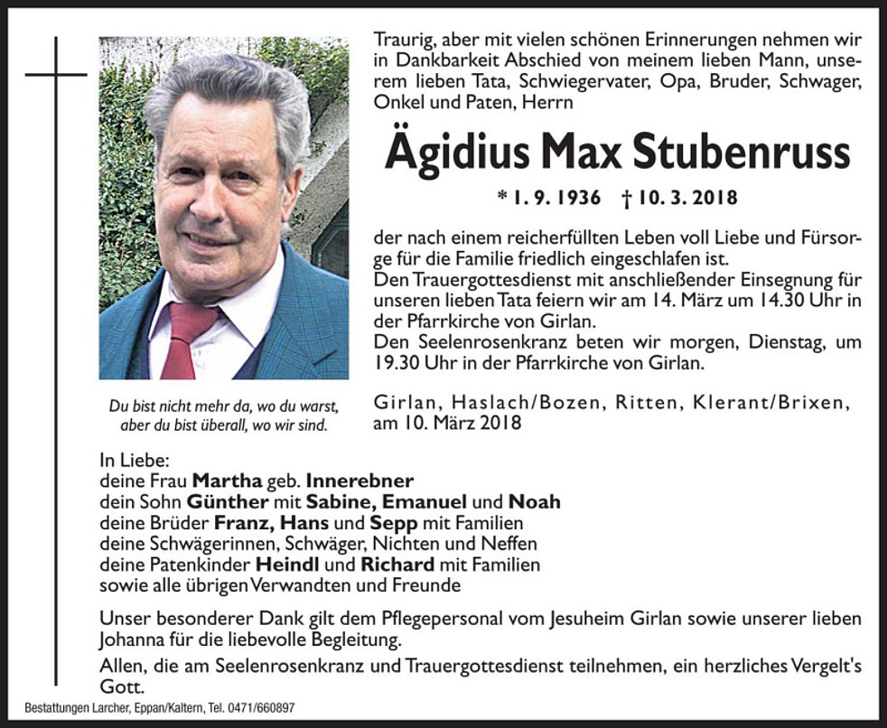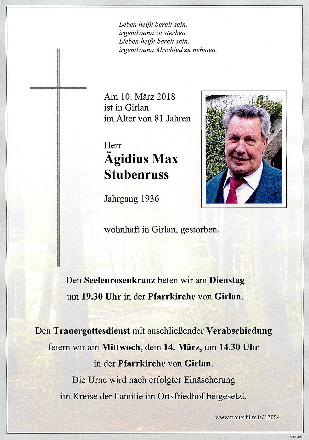 Den Trauergottesdienst mit anschließender Einsegnung für unseren lieben Tata feiern wir am 14. März um 14.30 Uhr in der Pfarrkirche von Girlan.