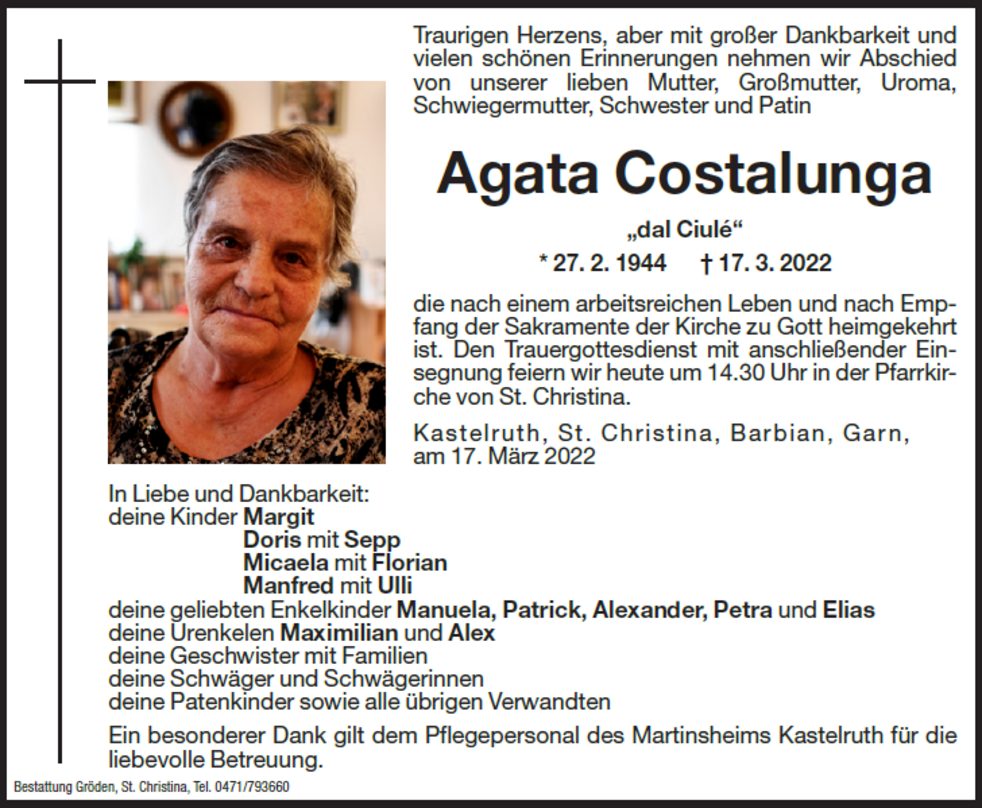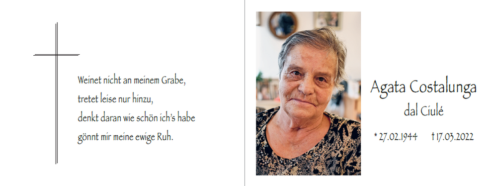 Den Trauergottesdienst mit anschließender Einsegnung feiern wir am Samstag, dem 19. März, um 14.30 Uhr in der Pfarrkirche von St. Christina.